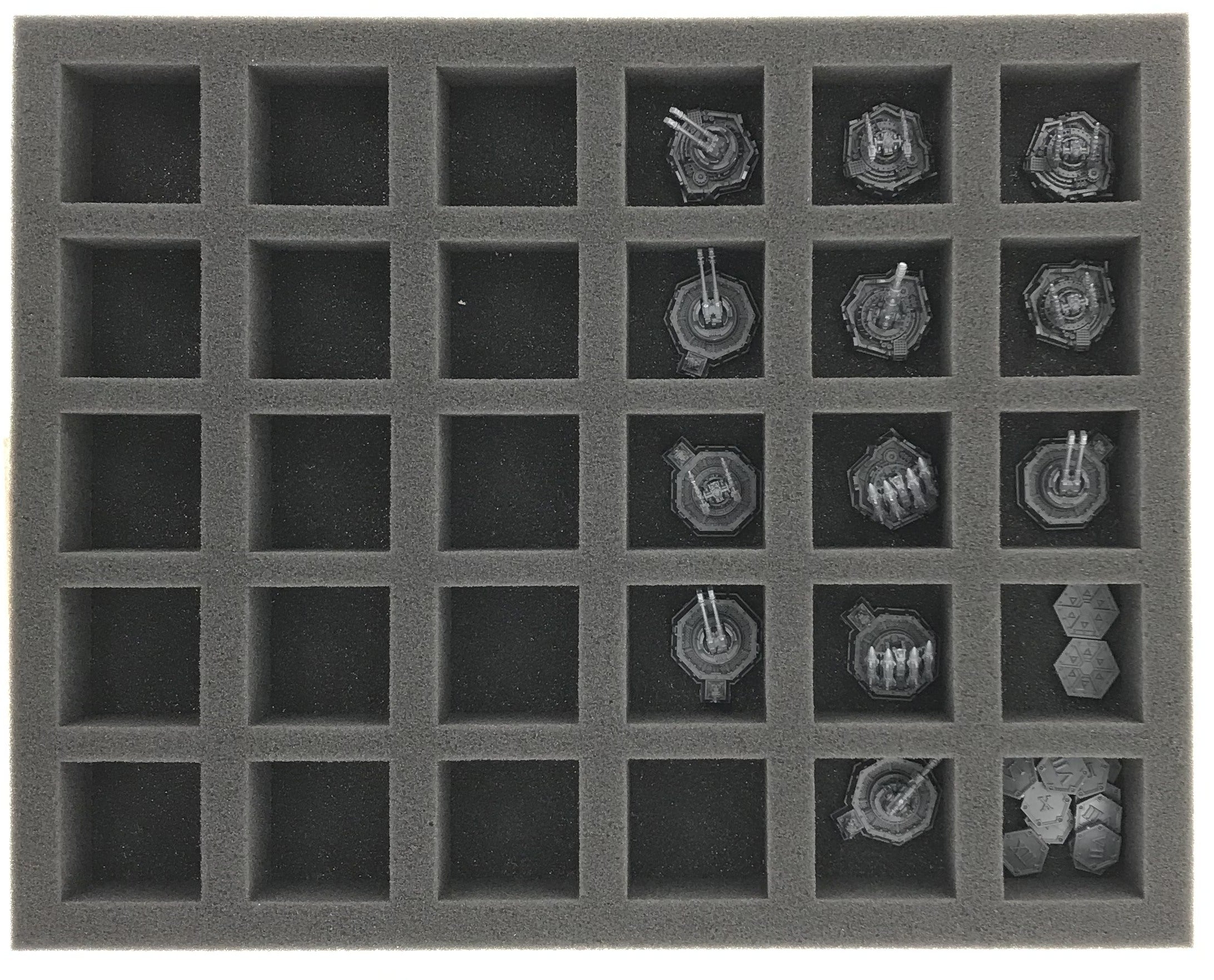 En esta bandeja de espuma Full-Size con 30 compartimentos del mismo tamaño puede almacenar los activos de tierra de su Armada Imperial perfectamente separados entre sí. Los compartimentos están hechos a medida para las Baterías de Misiles Manticore, Baterías Hydra Flak, Búnkeres Imperiales y las Plataformas Flak.