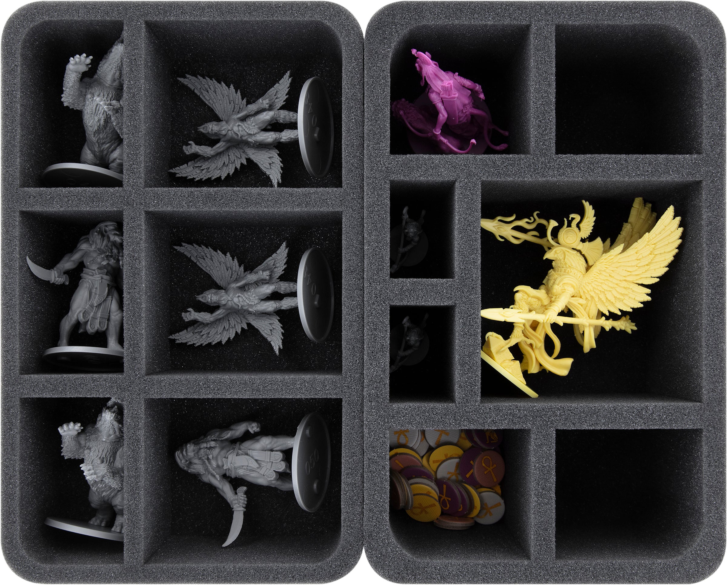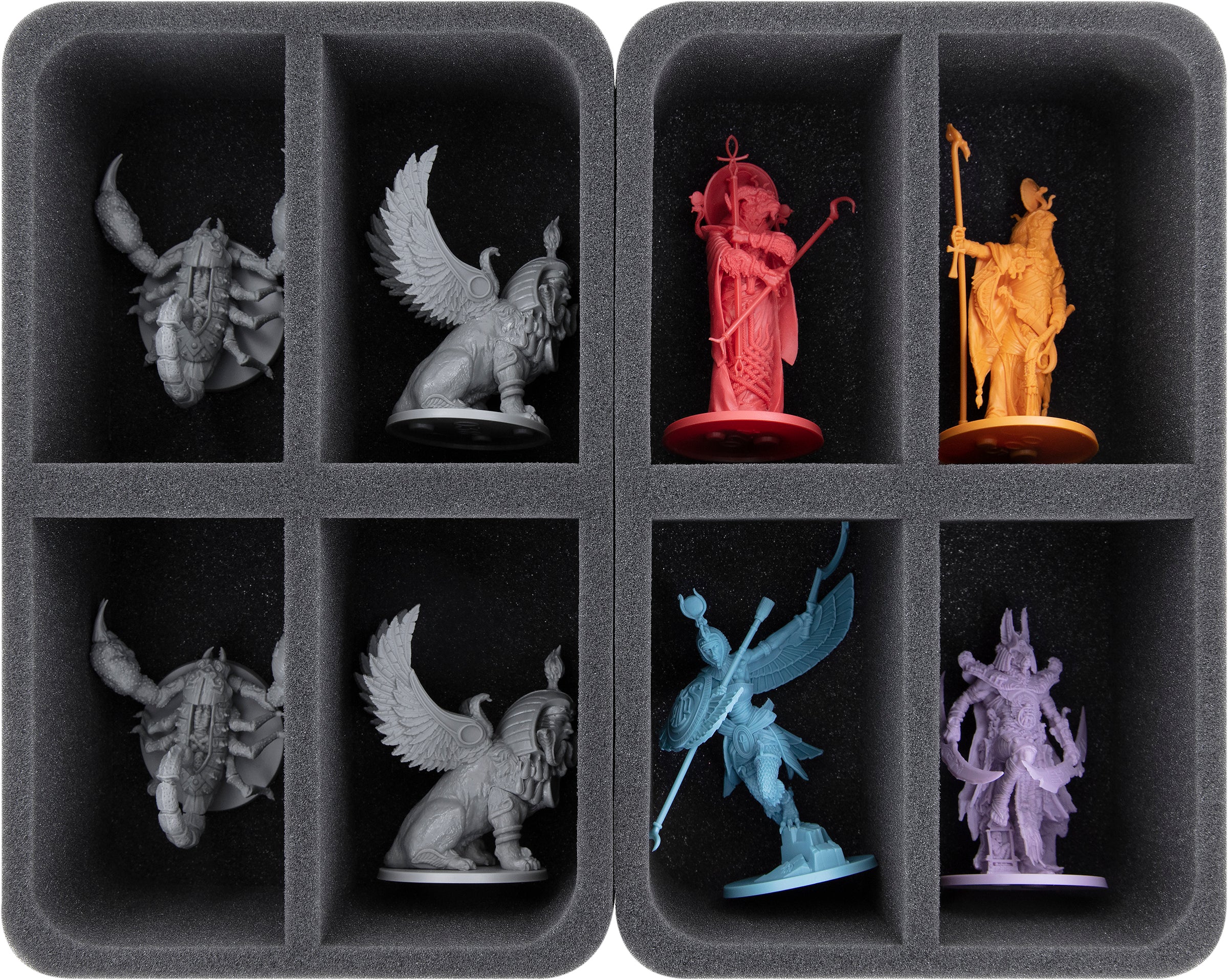 - 2 bandejas de espuma Half-Size con 4 compartimentos cada una para miniaturas grandes como Androsphinx, Escorpiones Gigantes, Ra, Anubis, Isis, Ramun (HSMFEA080BO)