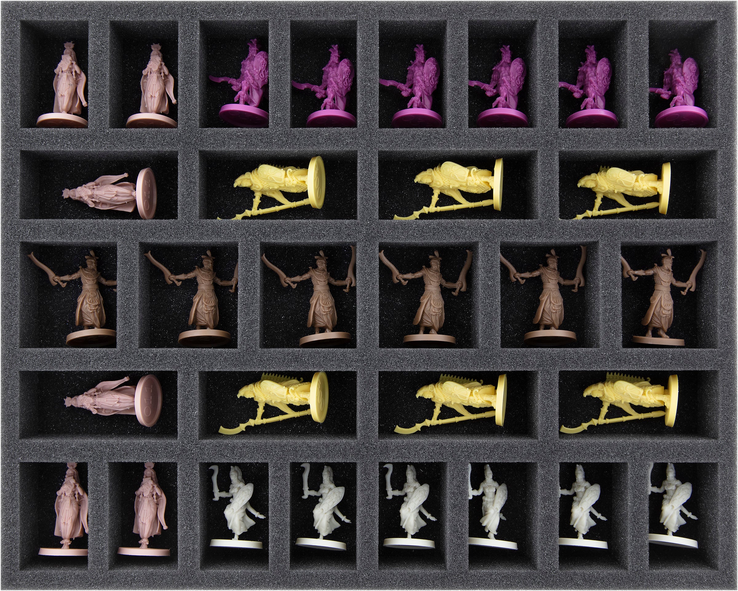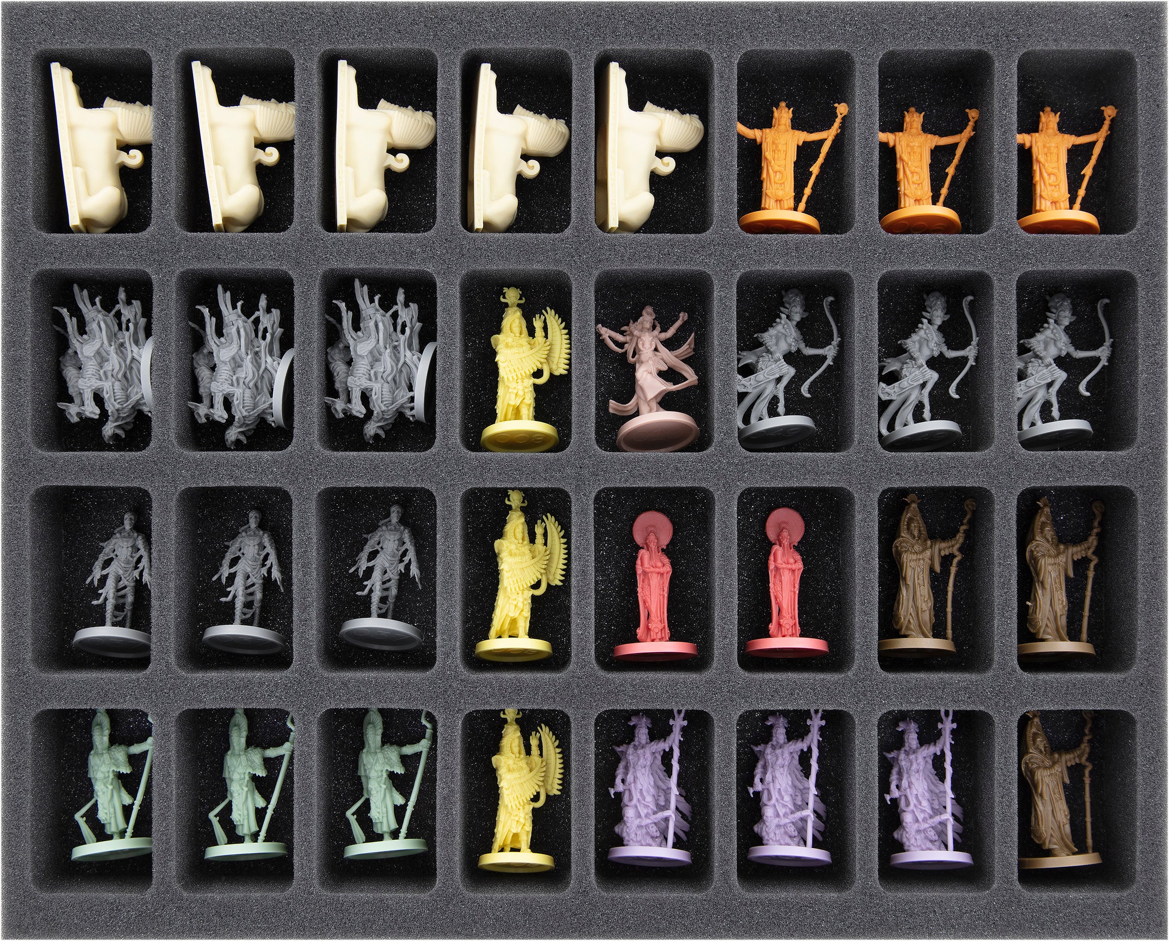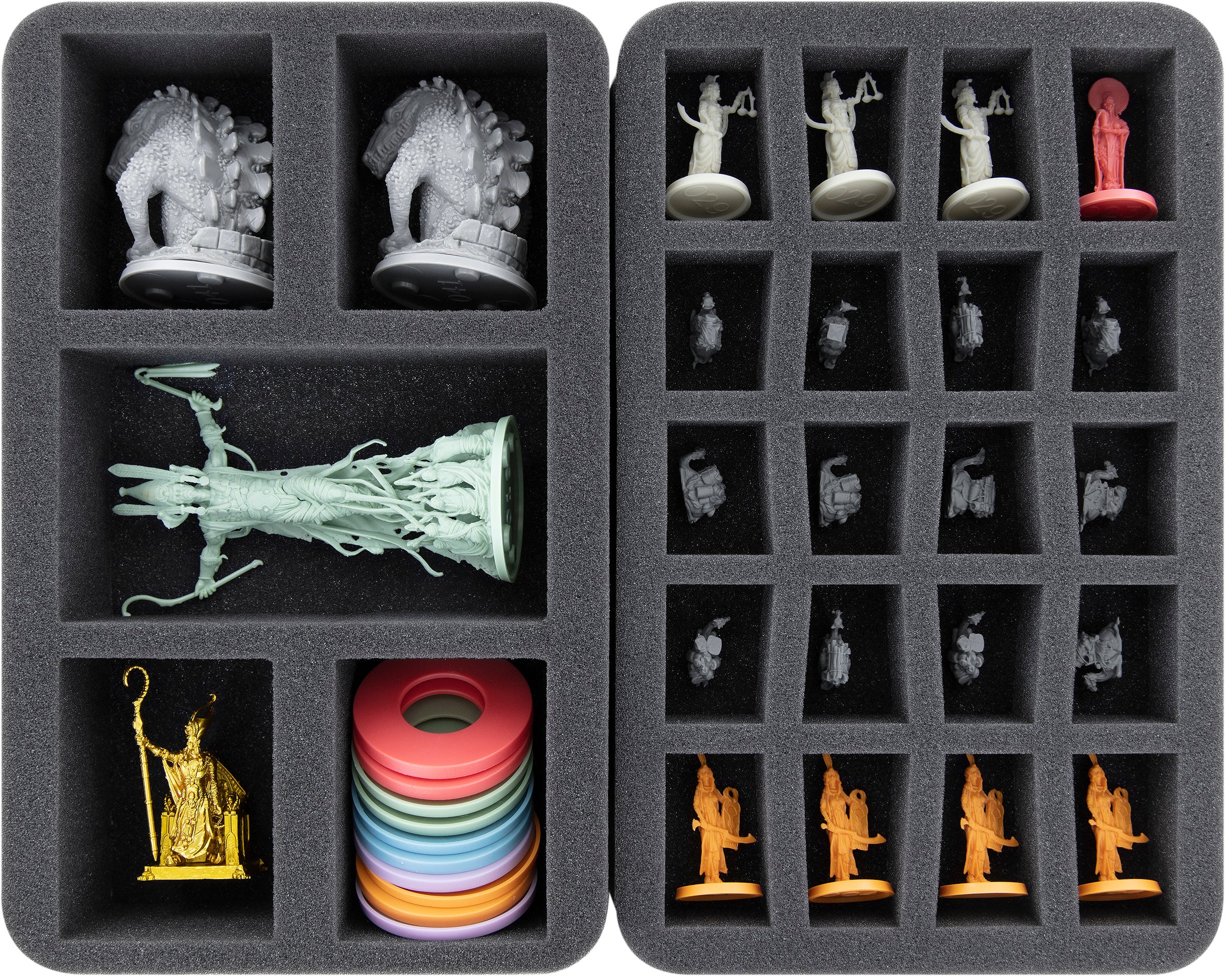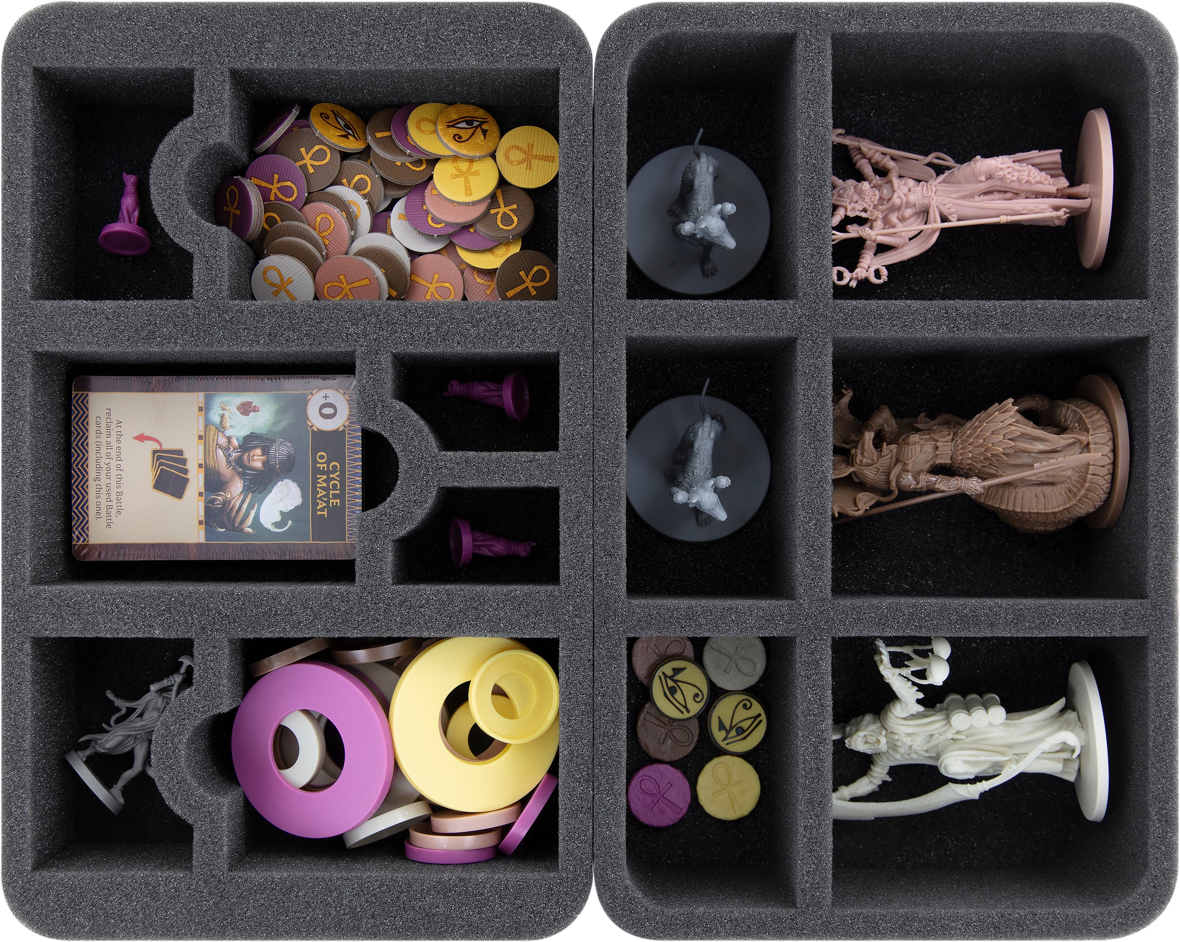 - 2 bandejas de espuma Full-Size con 32 compartimentos cada una para miniaturas pequeñas como Guerreros, Sacerdotes, Momias Gato, Momias, Satet + Esfinges 3D exclusivas de Kickstarter (FSMEDS040BO)