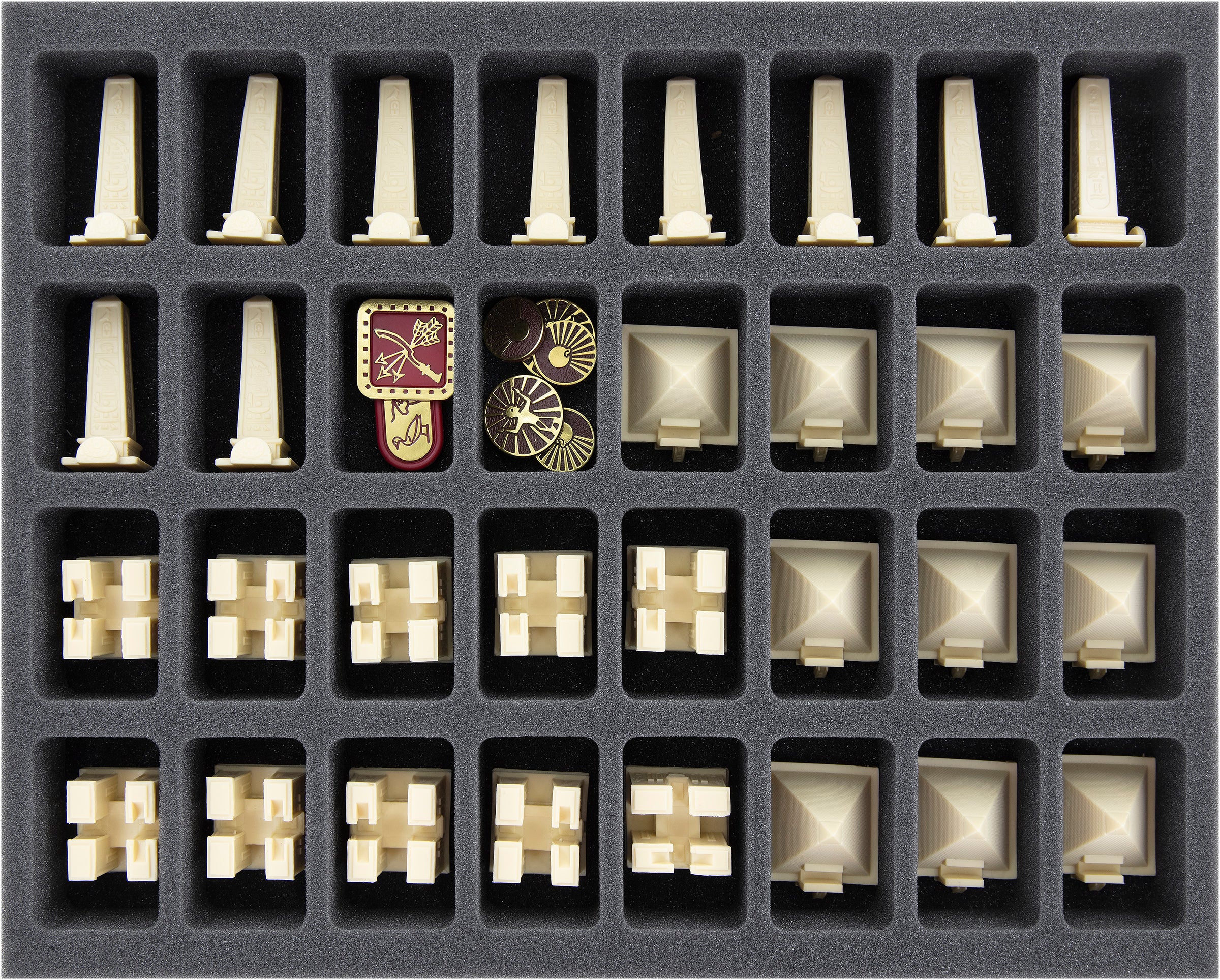 - 1 bandeja de espuma Full-Size con 32 compartimentos para miniaturas como Templos 3D, Obeliscos 3D y Pirámides 3D + materiales de juego (FSMEDS040BO)