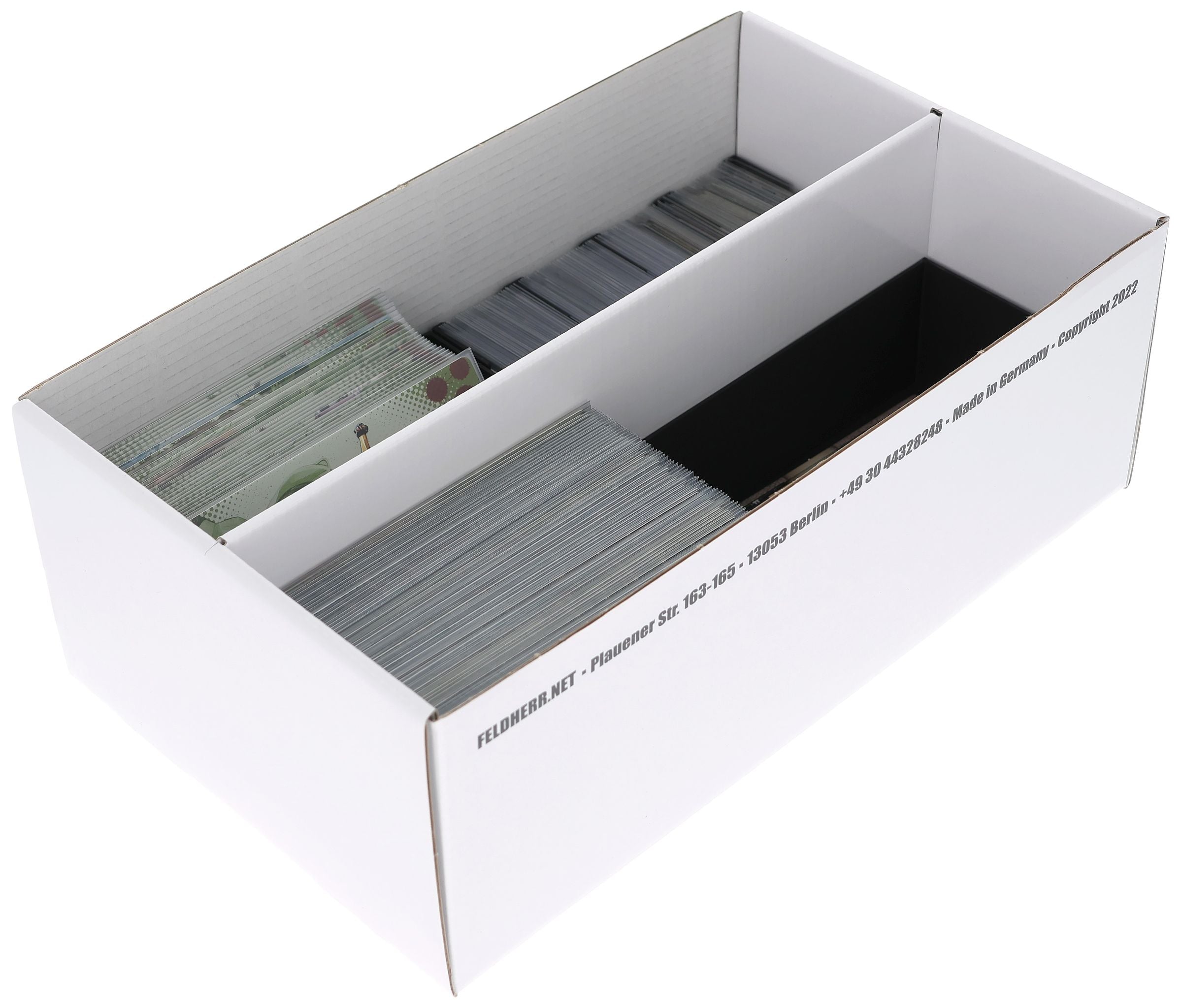 La base es de cartón blanco revestido. Un tabique en el centro de la caja la divide en dos compartimentos de igual tamaño. De este modo, las cartas pueden colocarse ordenadamente sin mezclarse durante el transporte.