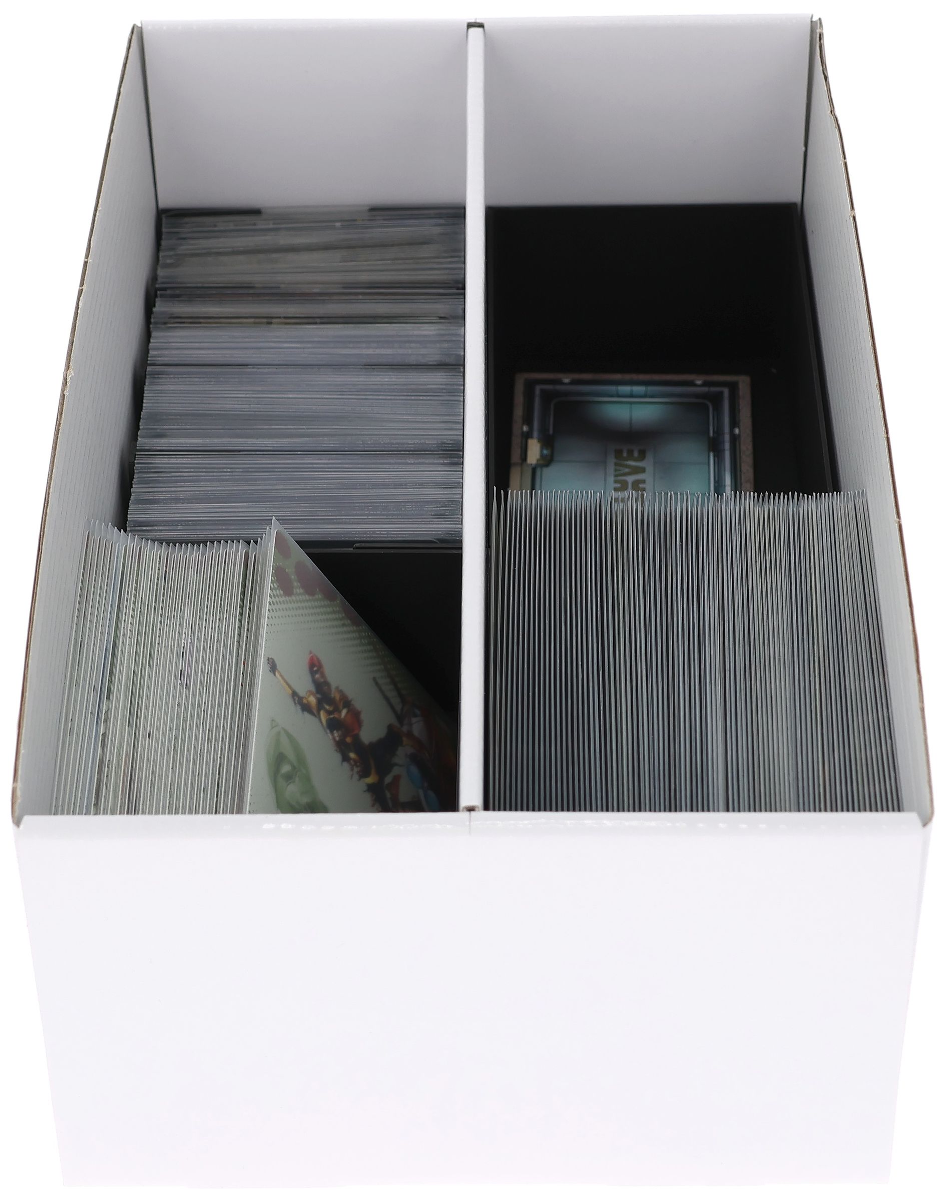 La tapa deslizante también está hecha de cartón estable revestido. Protege las tarjetas del polvo y otras influencias externas.