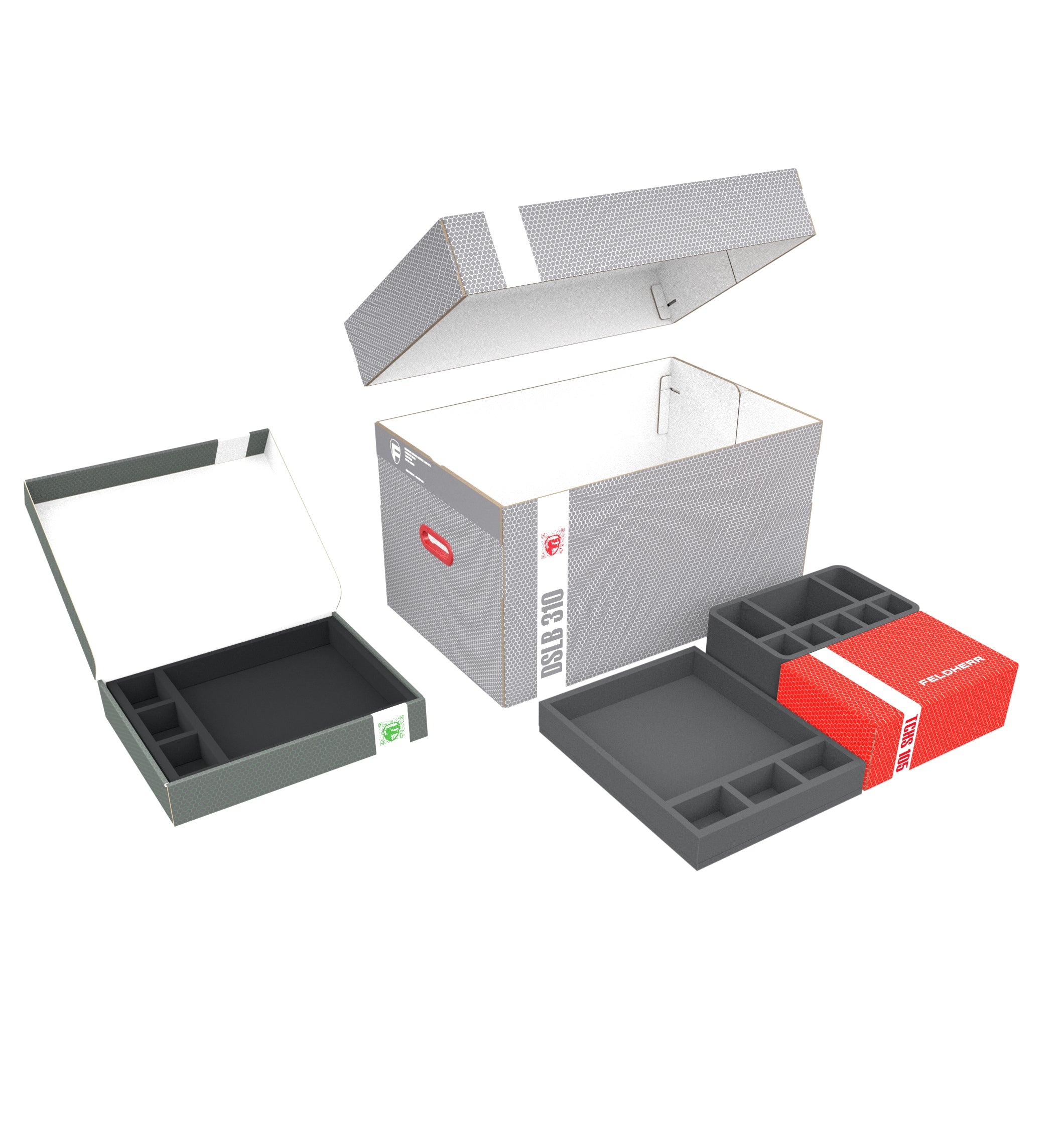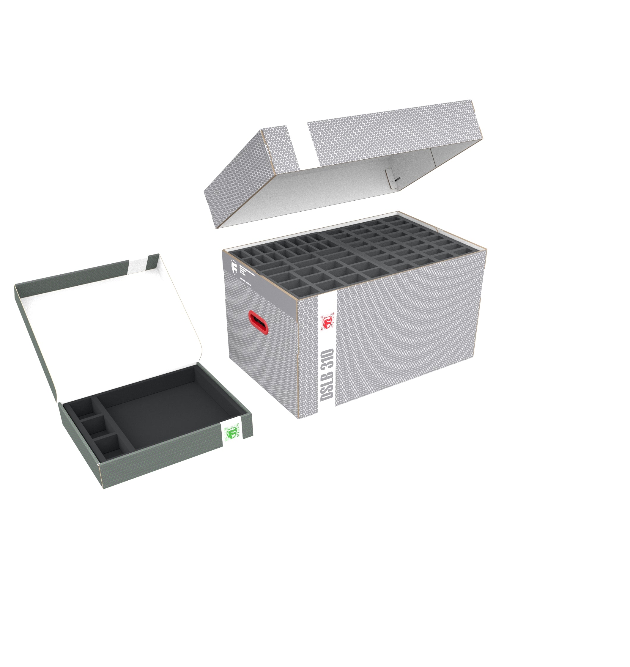 Las cajas de almacenamiento DSLB310 y FSLB055 están fabricadas en cartón ondulado revestido, lo que las hace no sólo agradablemente ligeras, sino también muy resistentes al desgarro y estables. La tapa acoplable de la DSLB310 protege de forma fiable el contenido del polvo y otras influencias externas. Con los correspondientes bandeja de espumas, miniaturas, el material de juego y todos los demás artículos pueden almacenarse de forma segura, y transportarse cómodamente con las dos asas de transporte reforzadas con plástico situadas en los laterales de la DSLB310.