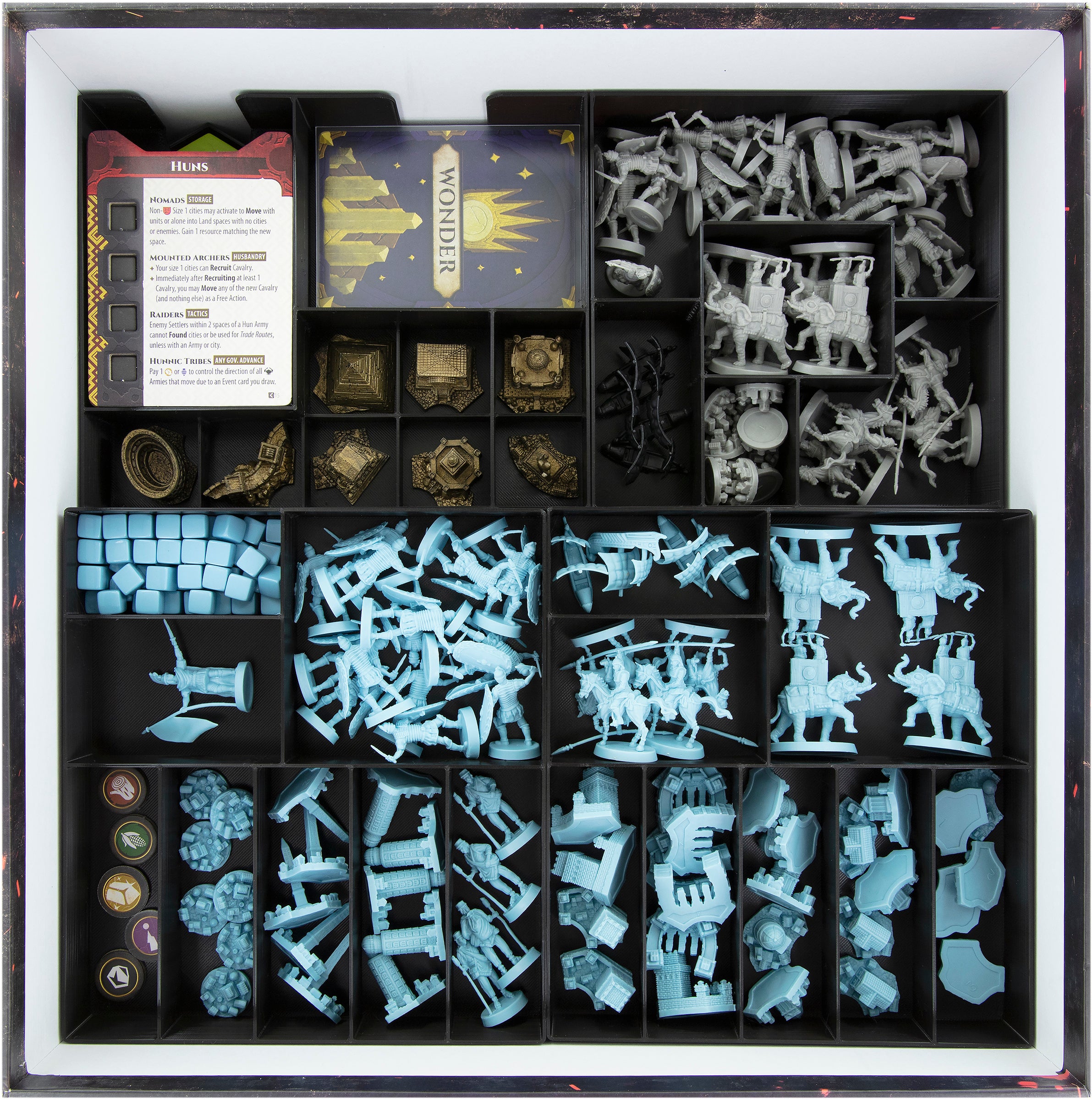 Mientras tú llevas a tu pueblo y a tu cultura a la riqueza y la gloria, nosotros ponemos orden en tu caja del juego de mesa. Cuatro tarjeteros de plástico y doce inserciones de plástico se encargan de que tu material de juego esté ordenado en el caja del juego de mesa original. Claramente estructurado, encontrar las piezas necesarias es un juego de niños. Así se ahorra la laboriosa clasificación previa y puede aprovechar el tiempo ganado para seguir desarrollando su cultura.
