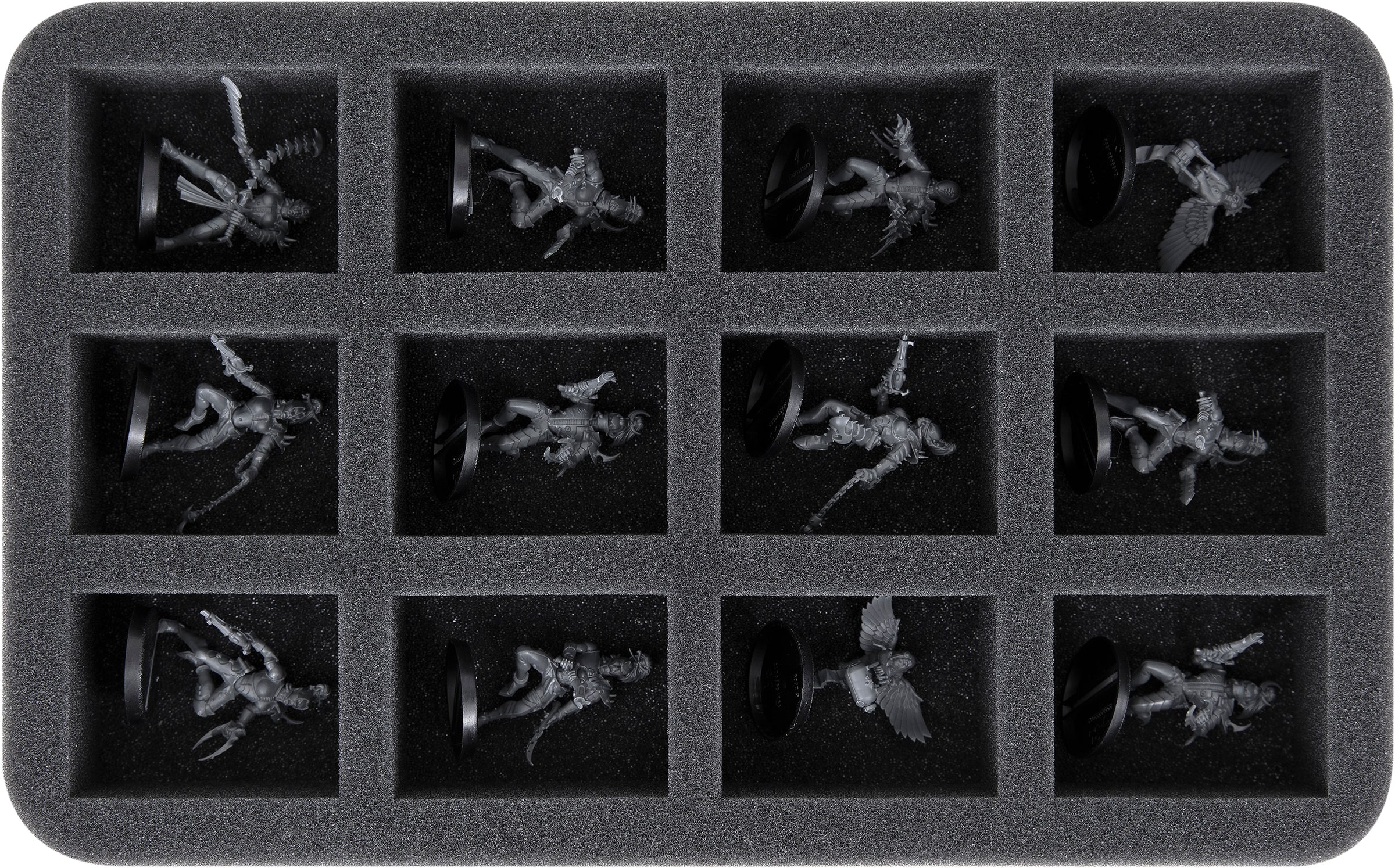 • 2 Half-Size bandeja de espuma, cada una con 12 compartimentos para infantería estándar como Guardianes de la Tormenta, Defensores de los Guardianes, Rangers y modelos con dimensiones similares (HS040A026)