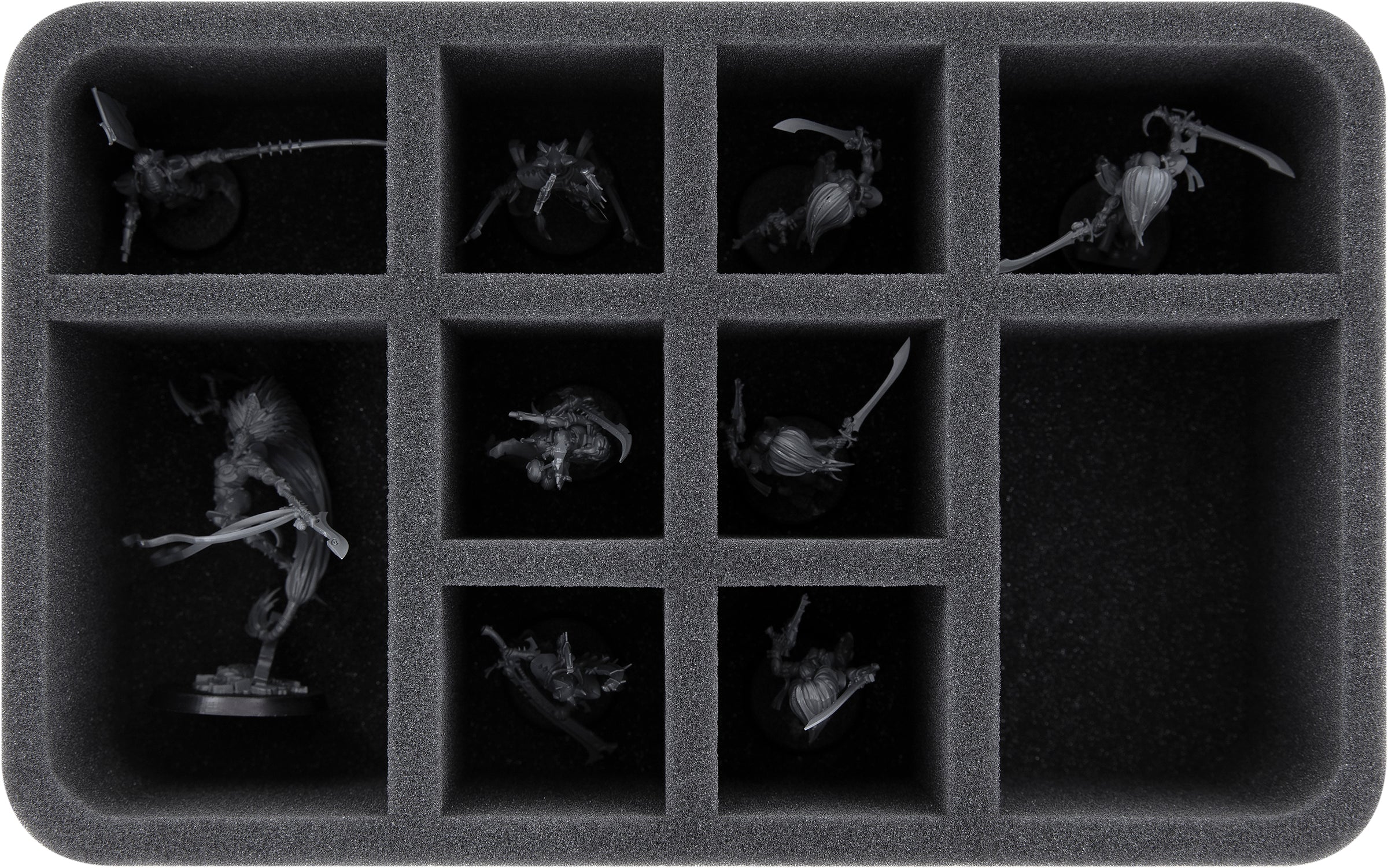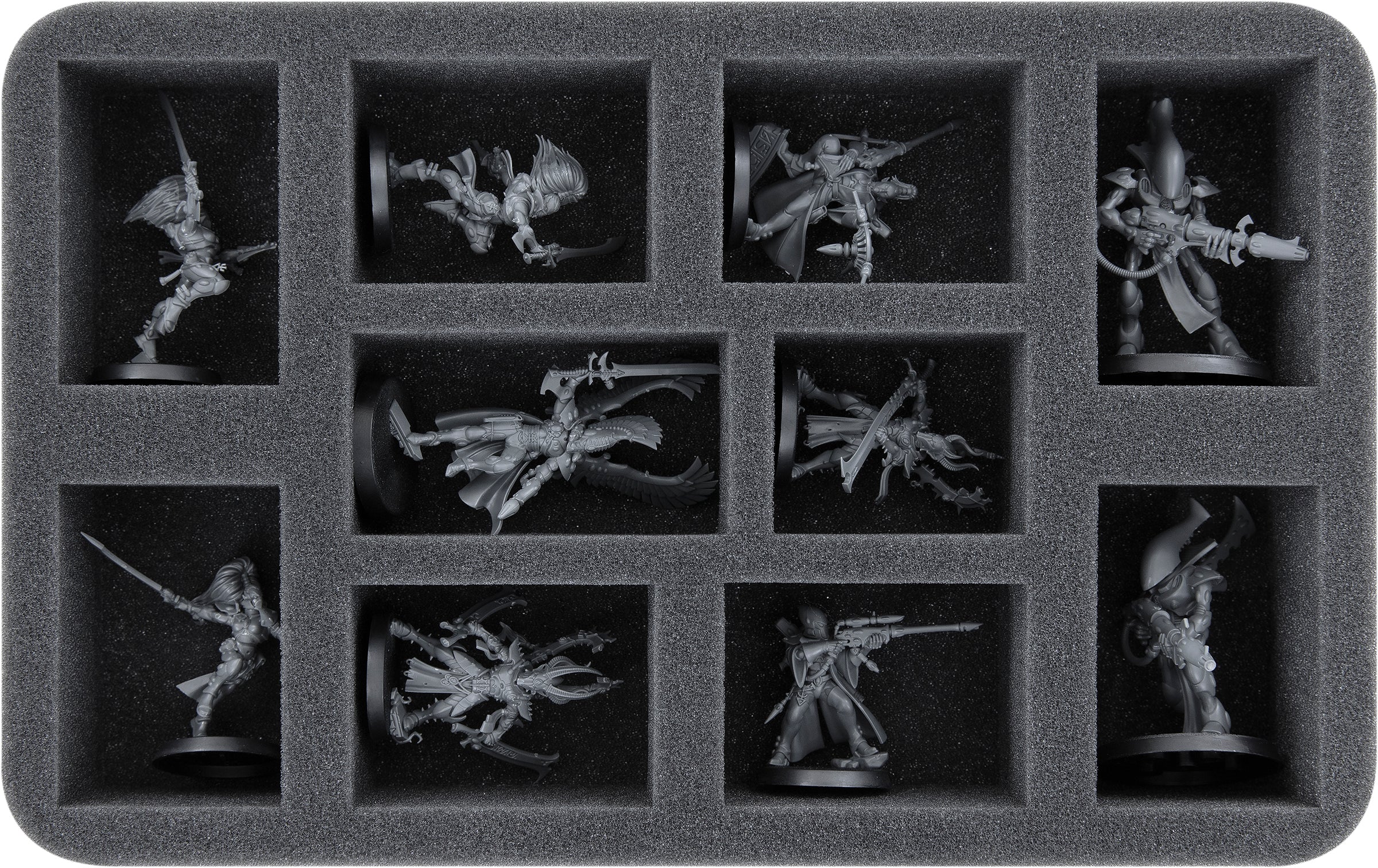 • 1 Half-Size bandeja de espuma con 10 compartimentos para modelos de infantería como Banshees Aulladoras, modelos de personajes voluminosos como Jain Zar, y modelos con dimensiones similares (HS080A009)