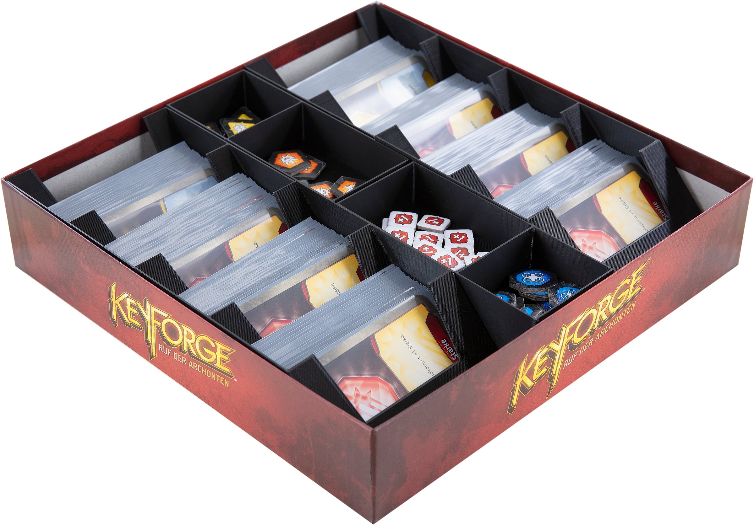 - El organizador encaja perfectamente en la caja original del juego de mesa "Keyforge: Call of the Archons" Starter Set.