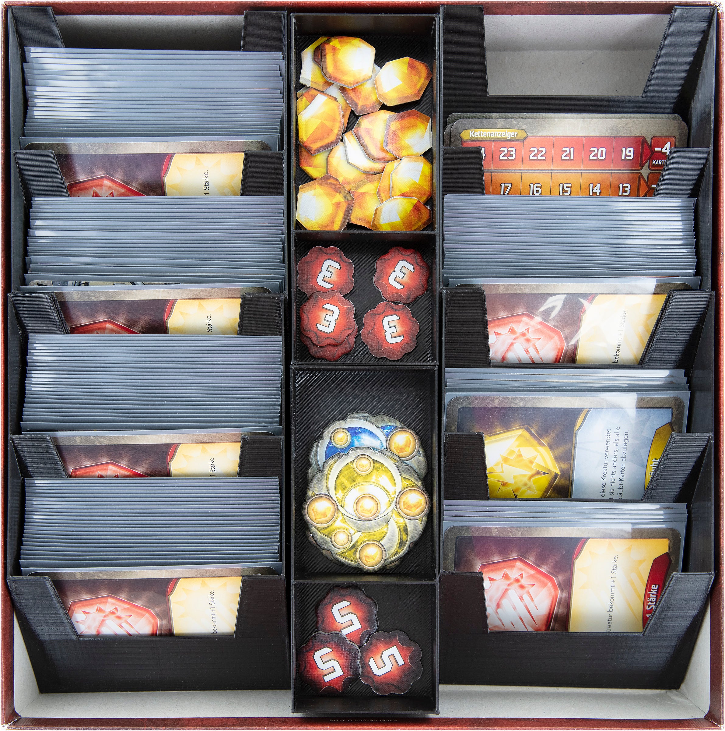 - 4 porta cartas para los dos mazos de inicio "Argus el Sublime Radiante" y "Señorita 'Onyx' Censorius" y los mazos adicionales de Keyforge + cartas de juego (cartas de Estado, cartas de Rastreador de Cadenas)