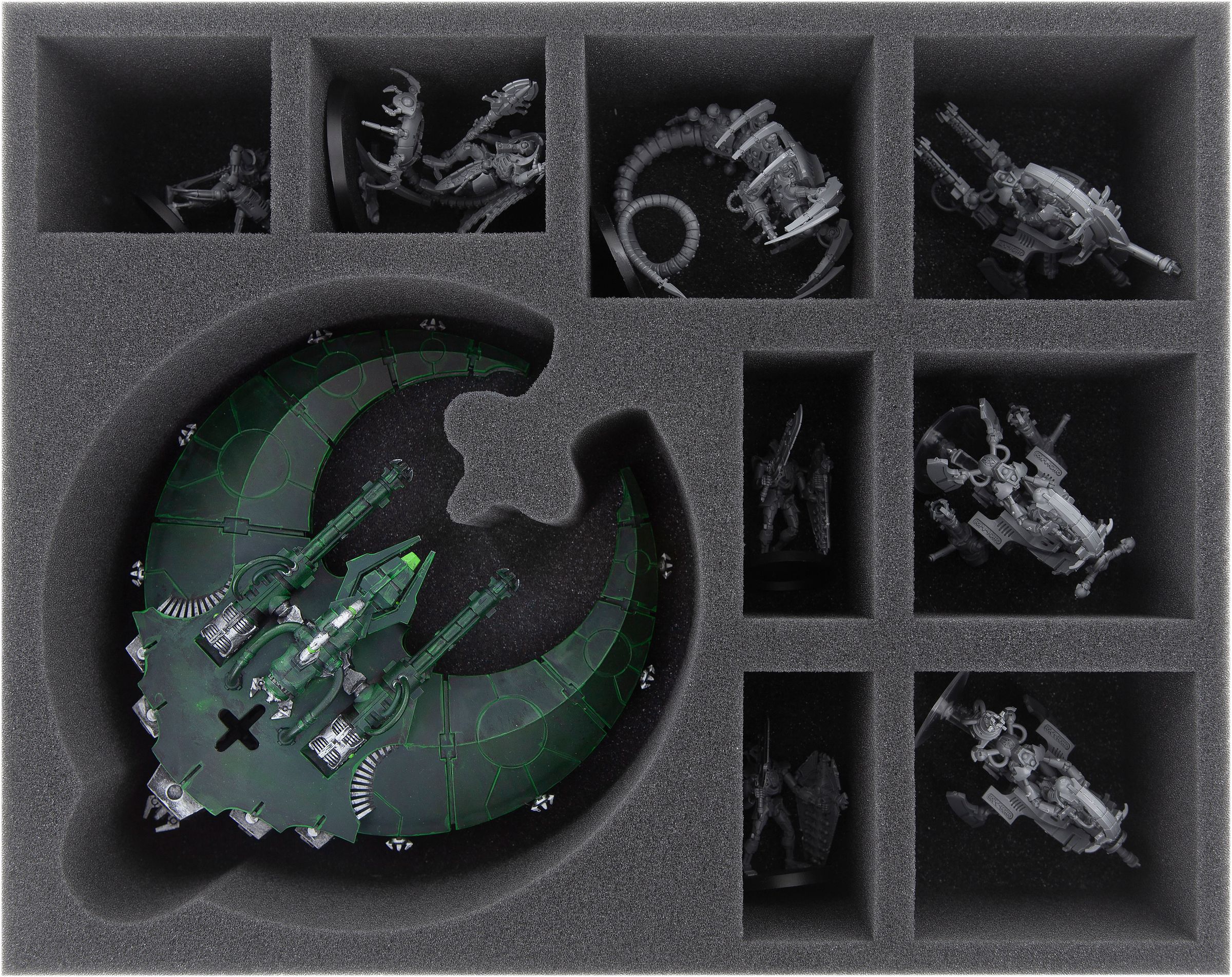 • 1 bandeja de espuma Full-Size con 9 compartimentos para, por ejemplo, Guadaña de la Perdición o Guadaña de la Noche + 8 Necrones más (FSMEJZ075BO)