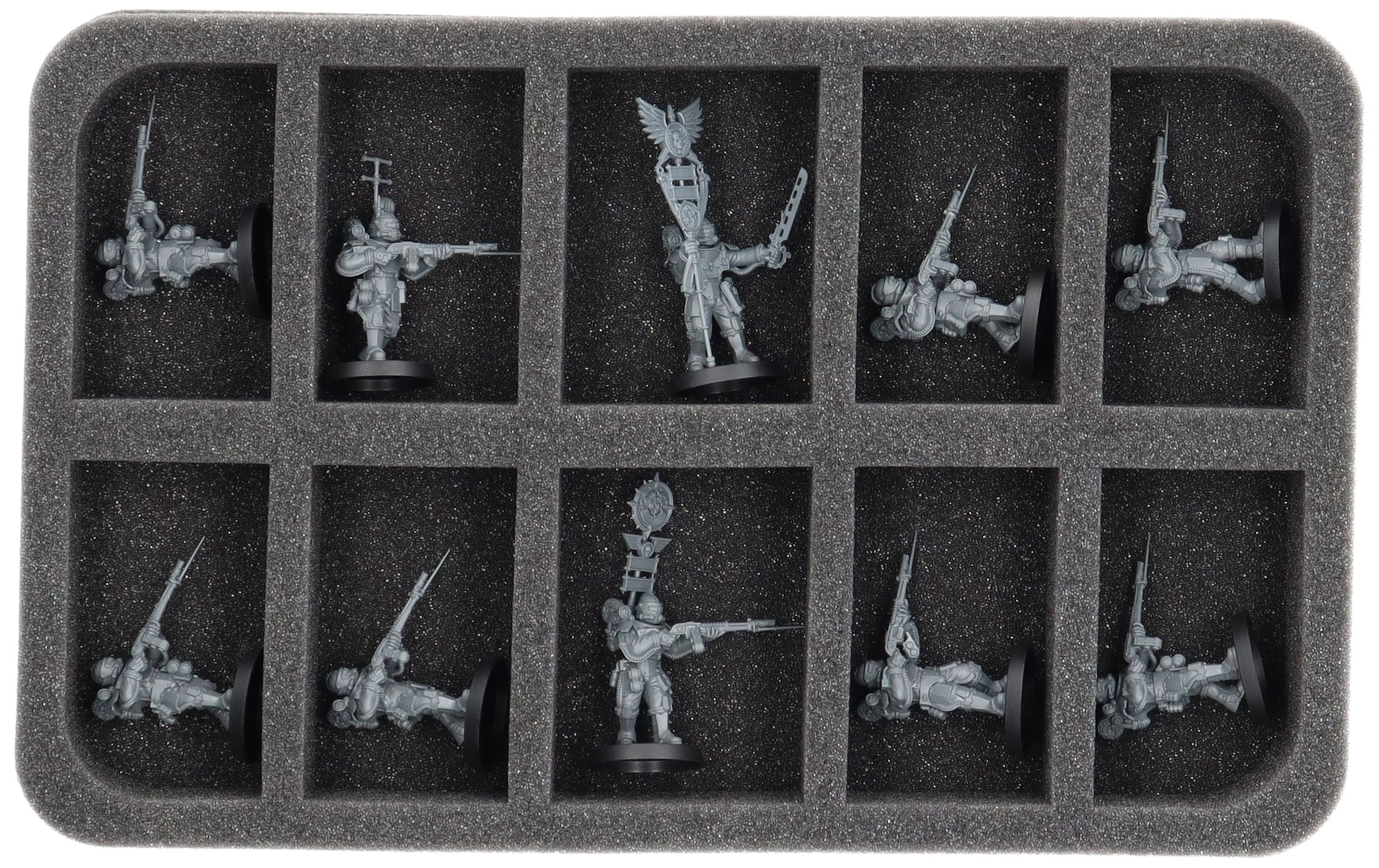 • 1 Bandeja de espuma de tamaño normal con 32 compartimentos para miniaturas como unidades de infantería estándar como: Cadians, Cazas de la Jungla Catachan o modelos de tamaño similar (FS040A020)