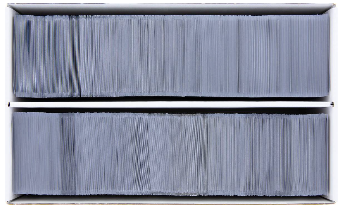 Un separador en el centro de la caja la divide en dos compartimentos de igual tamaño. Esto permite alinear las tarjetas sin que se mezclen durante el transporte.