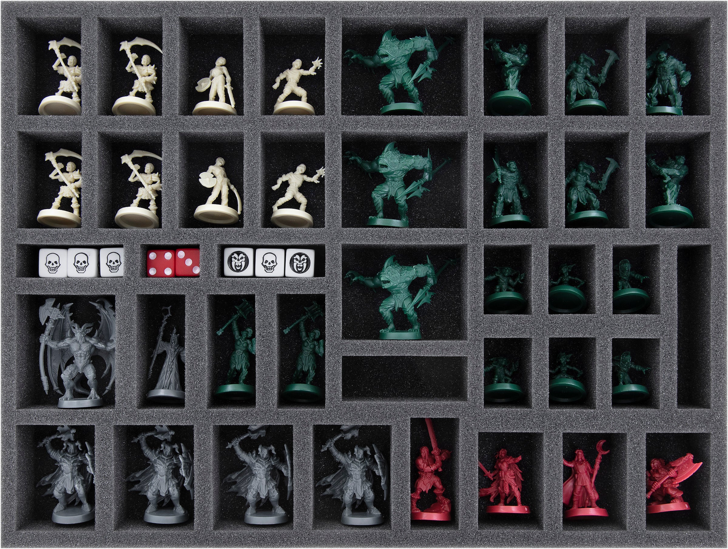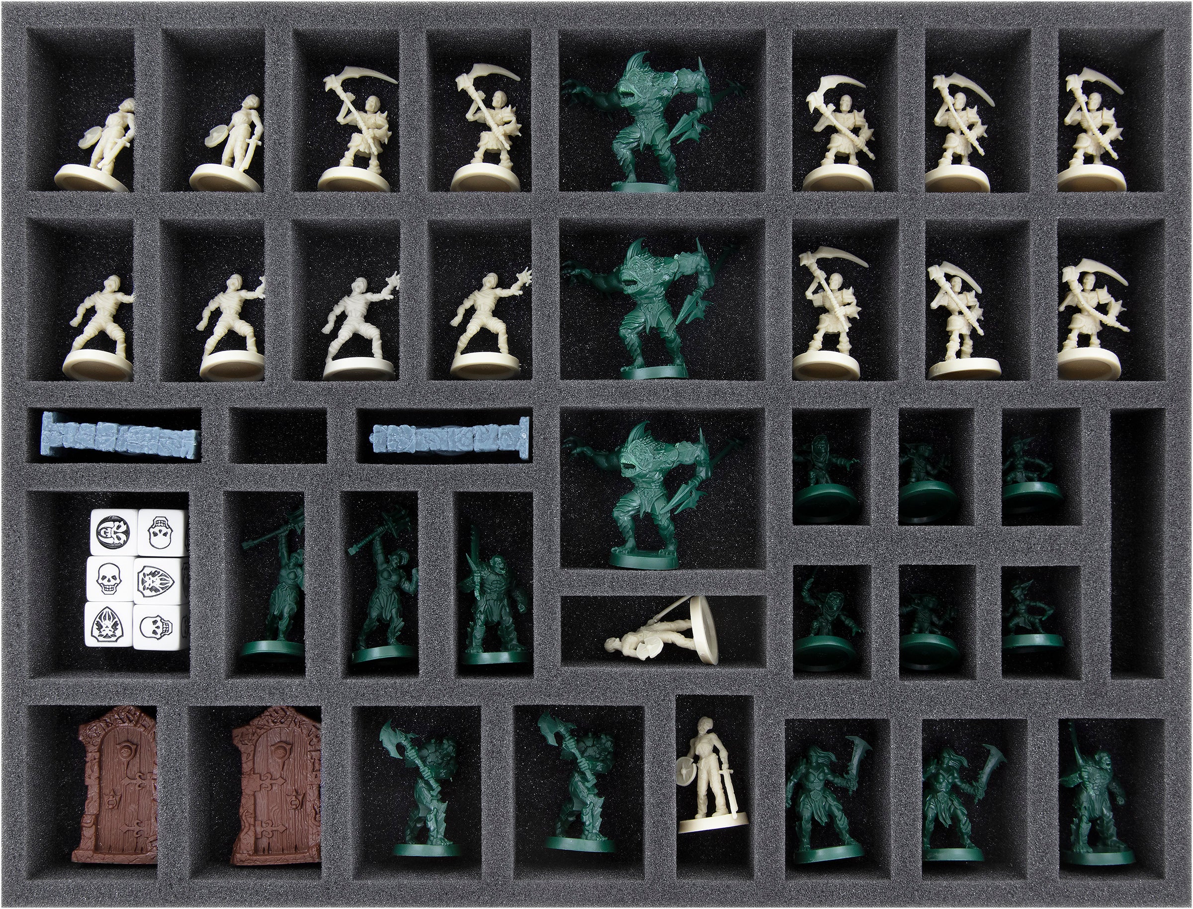 Distribuye los modelos, puertas y piezas de mobiliario del juego básico en dos bandejas, mientras que los miniaturas y las piezas de terreno de las expansiones "La Fortaleza de Kellar" y "El Retorno del Señor Brujo" comparten una bandeja. Las figuras de "El Horror Congelado" reciben un bandeja de espuma de 60 mm de altura para su protección, y el contenido de "El Mago del Espejo" se guarda en una bandeja de 70 mm de altura.
