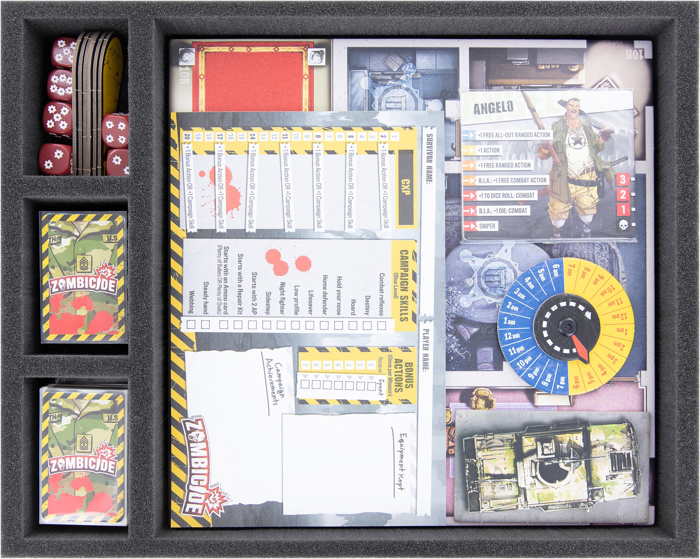 - Todas las miniaturas, cartas de juego y accesorios completos del juego básico, la Caja de Reinicio, las dos expansiones Washington Z.C y Fort Hendrix, y de 6 Compras Opcionales de la campaña de Kickstarter caben en el set.