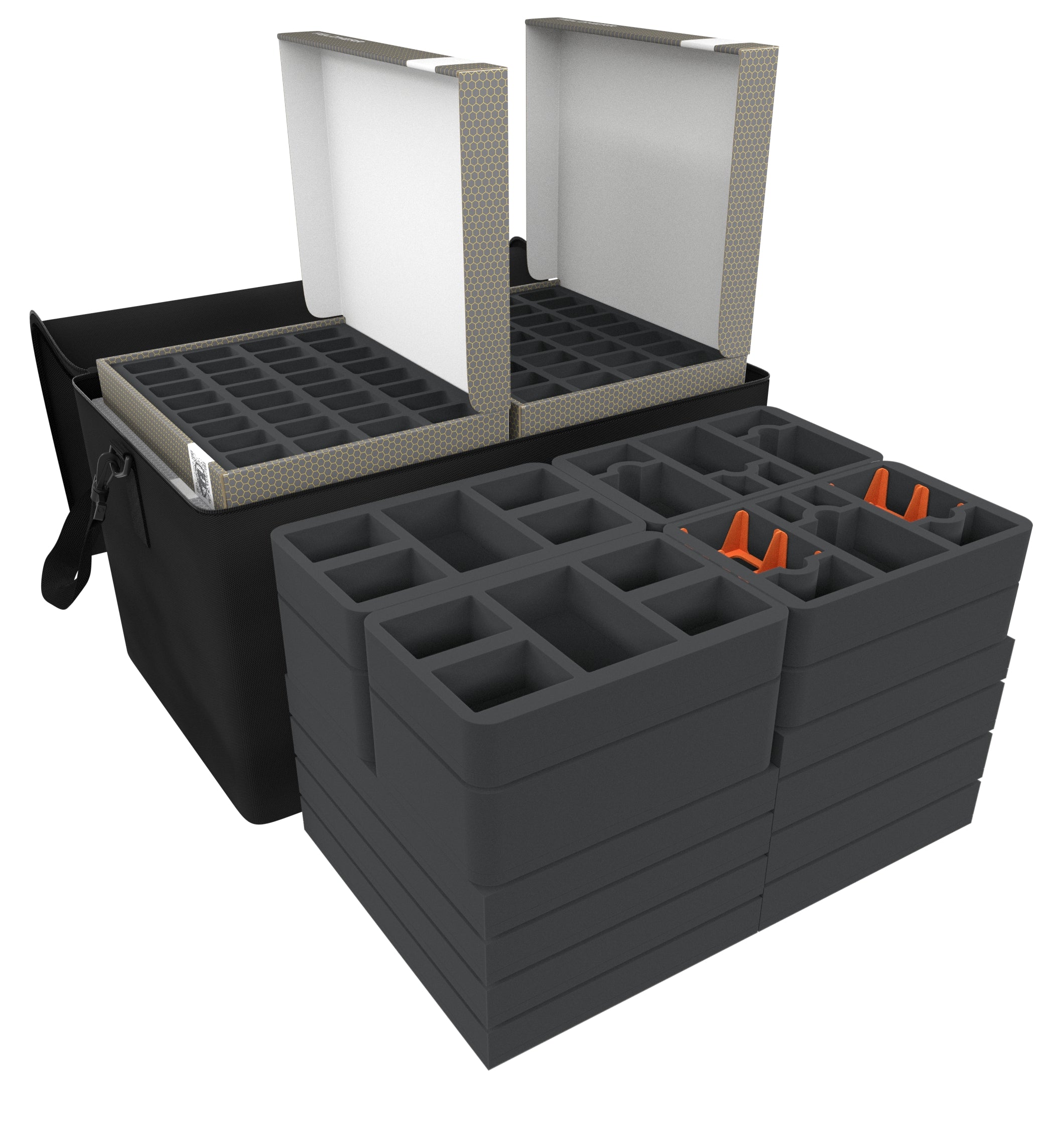 - 4 bandejas de espuma Full-Size con 32 compartimentos cada una para miniaturas (FSMEDS040BO)