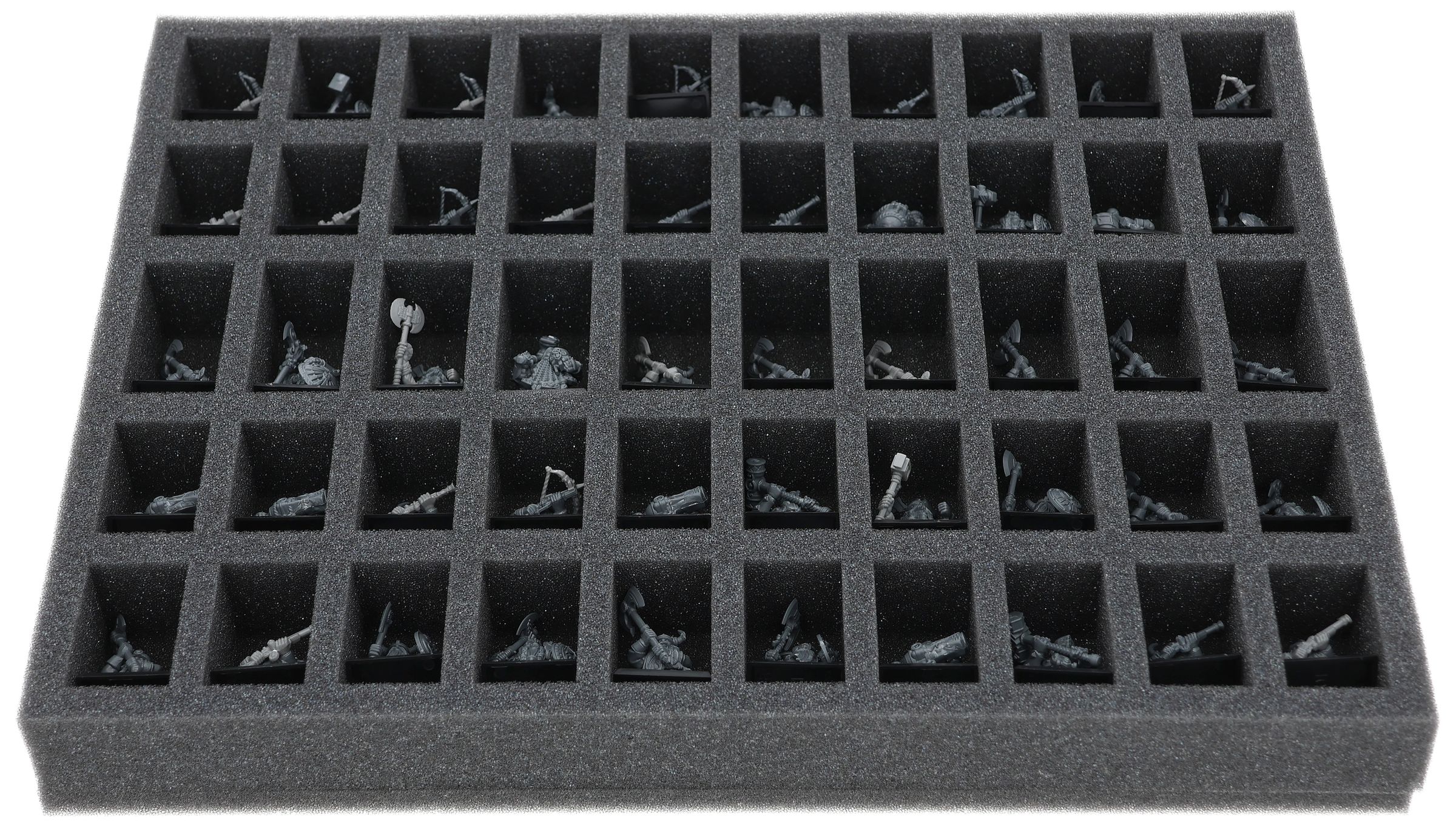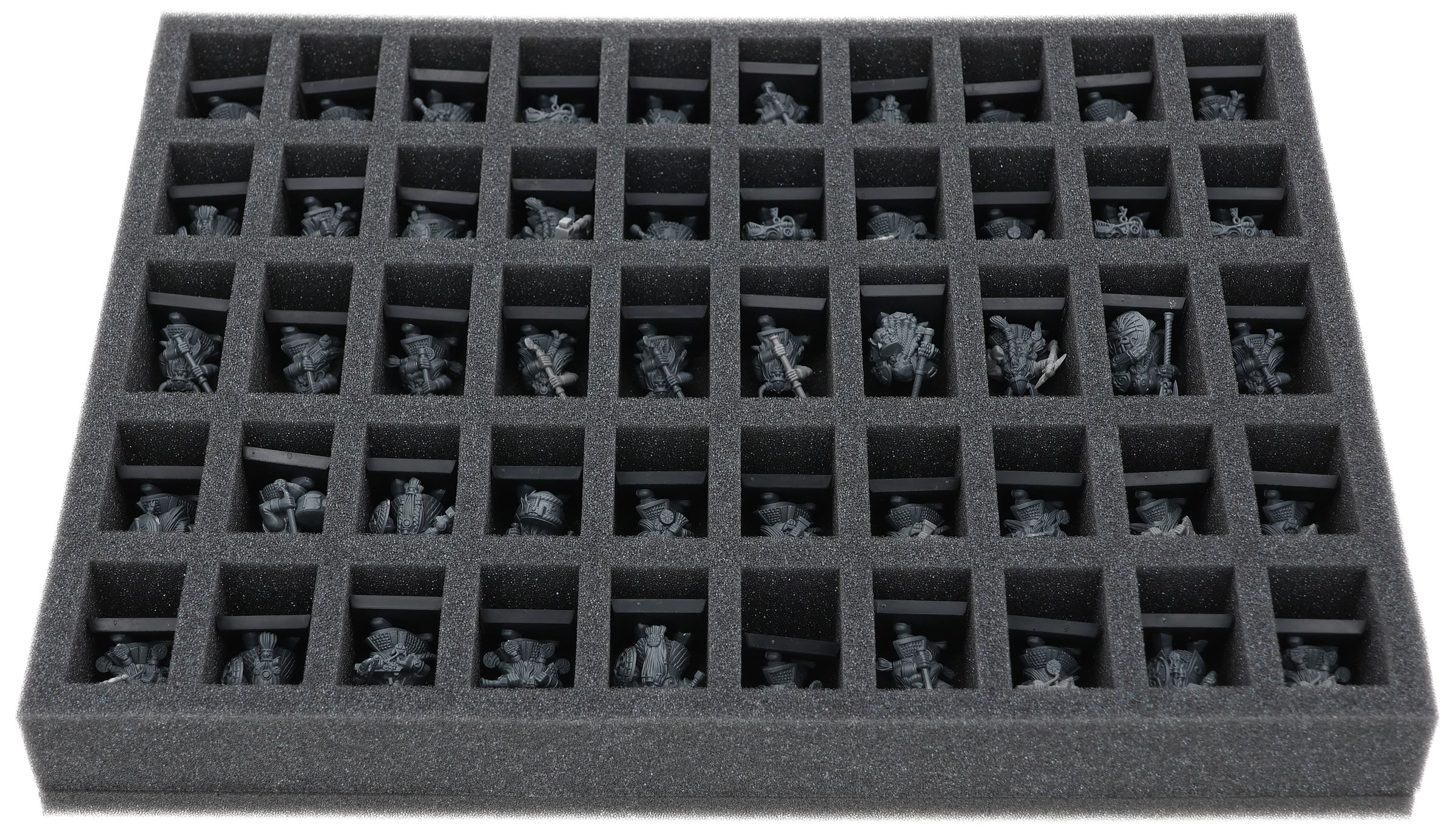 En esta bandeja de espuma Feldherr tienes espacio para hasta 50 miniaturas de tu ejército. El inserto es especialmente adecuado para almacenar los Guerreros Enanos, los Enanos Quarrelers, los Enanos Ironbreakers, los Enanos Hammerers, los Enanos Slayers y modelos de tamaño similar.