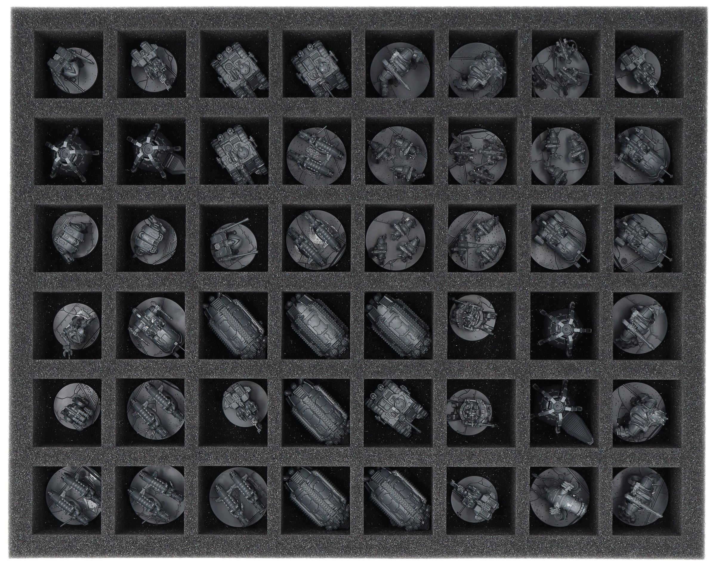 En esta bandeja de espuma Feldherr tienes espacio para hasta 48 miniaturas de tu ejército. El inserto es especialmente adecuado para guardar los Vultarax Stratos-Automata, Arlatax Battle-Automata, Domitar Battle-Automata, Vorax Battle-Automata, Castellax Battle-Automata, Thanatar Siege-Automata Cohort, Drop Pods y modelos de tamaño similar.