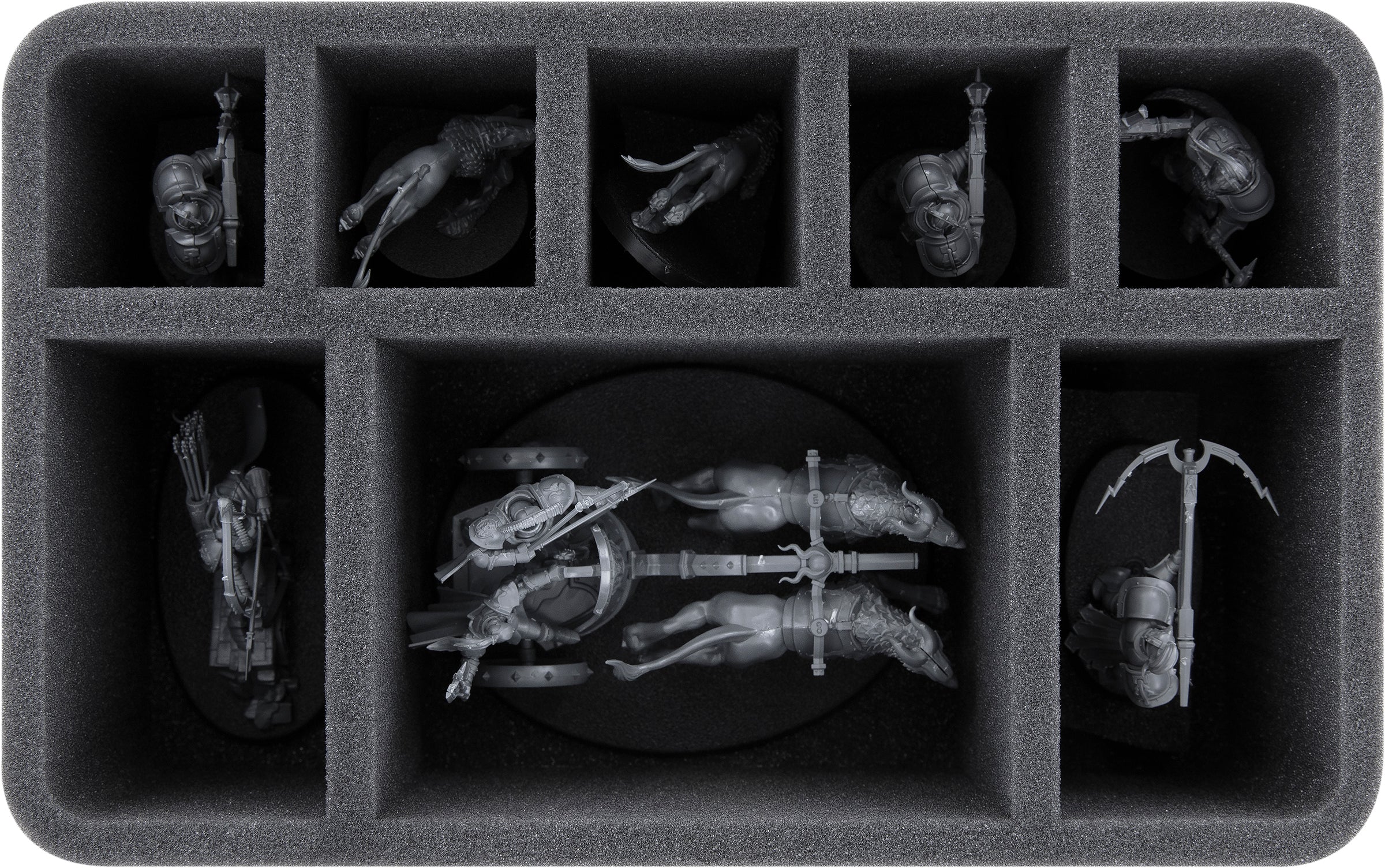 Tres Half-Size y un Full-Size bandeja de espuma ofrecen a tu ejército una protección óptima. Cada modelo cabe en su compartimento personalizado, desde el poderoso Señor del Caos hasta el Carro del Caos. El corte a medida garantiza que, incluso cuando se transportan a través del Varanspire, las miniaturas permanezcan firmemente en su sitio, y la suave espuma protege detalles sensibles como armas, cuernos y garras. Así, los colores de tus modelos pintados también se conservan y quedan protegidos de la abrasión y el desconchado de la pintura.