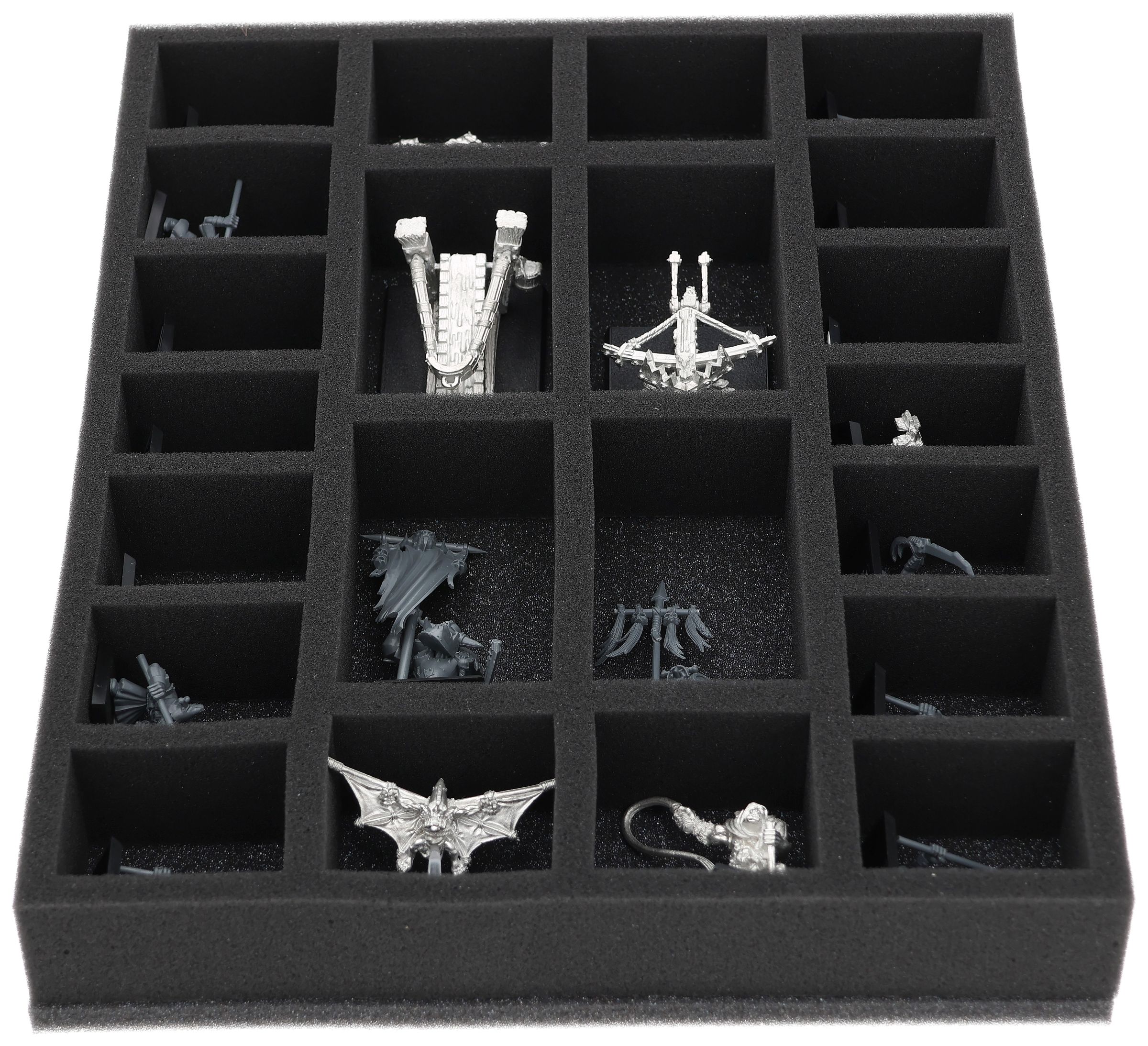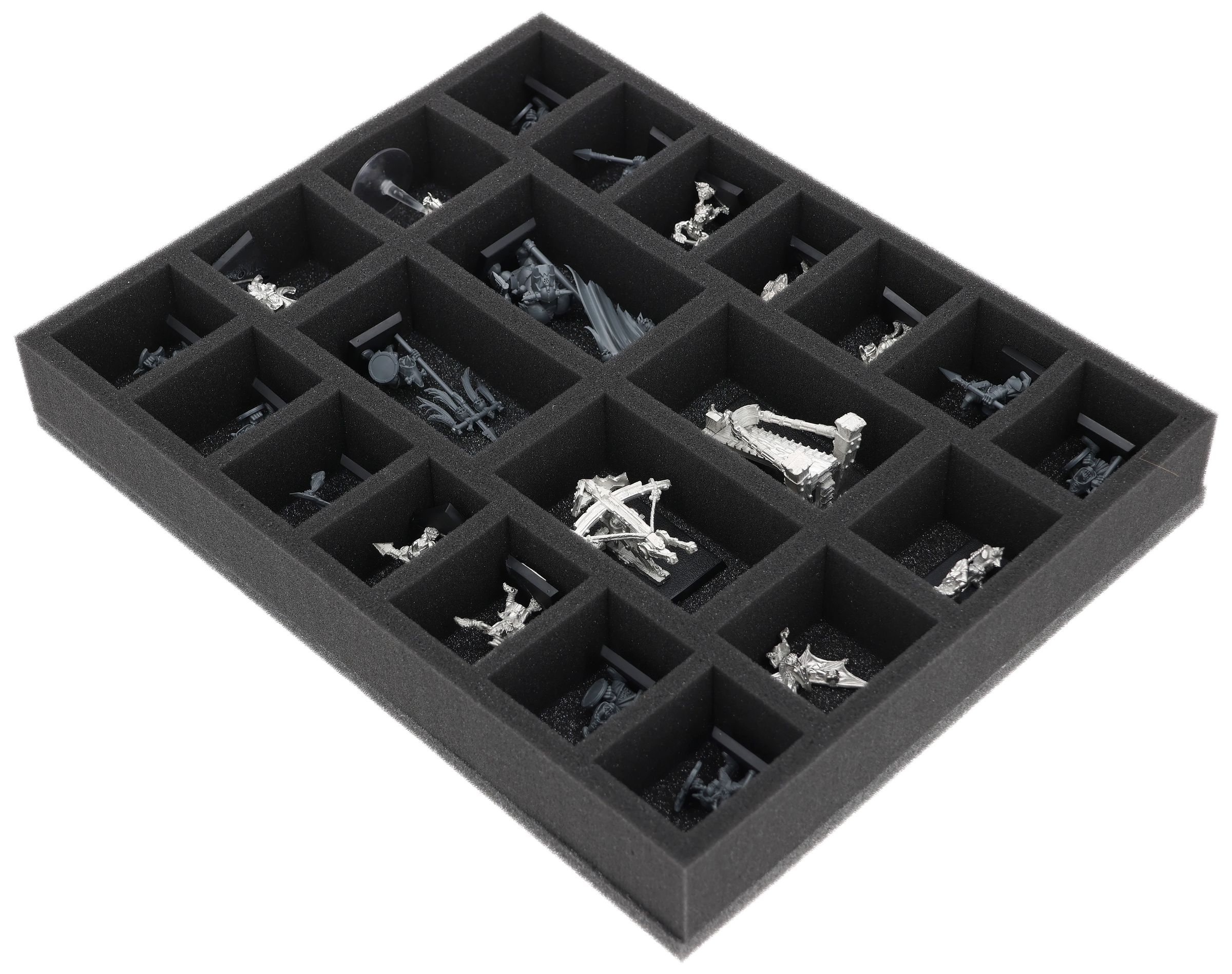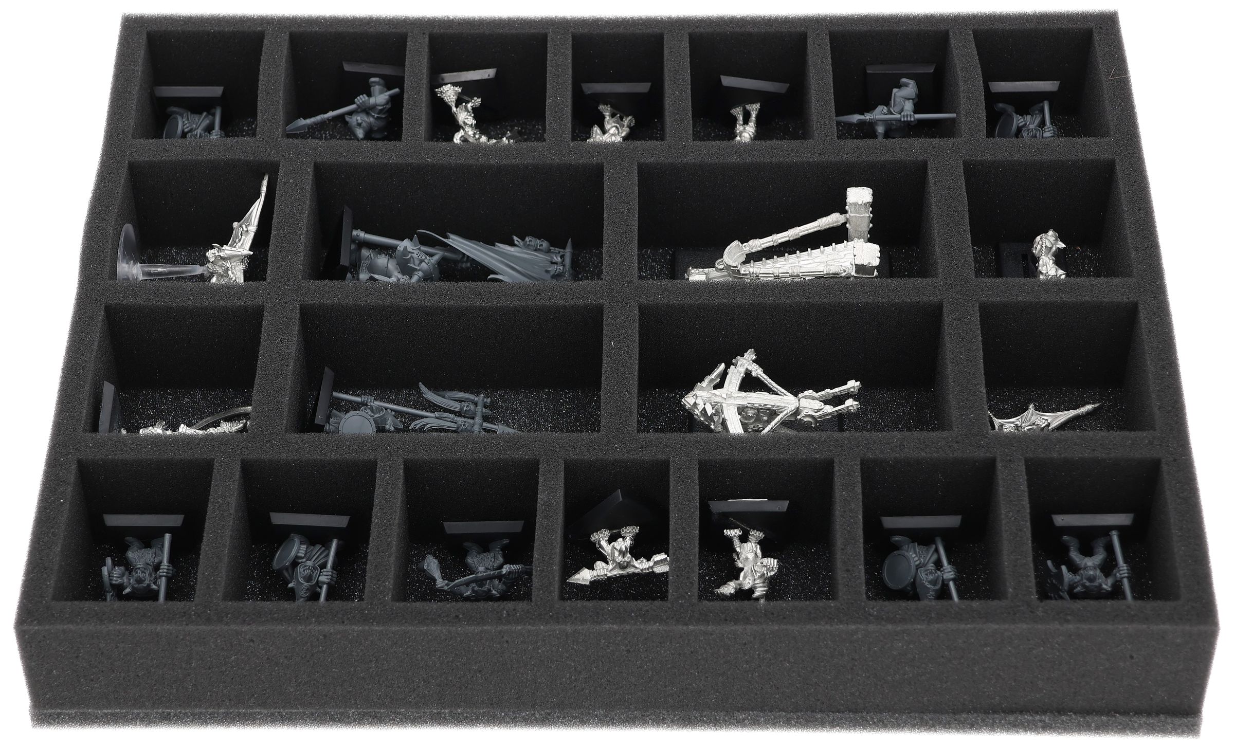On this Feldherr foam tray you have space for up to 22 miniatures of your army. The four large compartments are ideal for miniatures like Doom Diver Catapult, Goblin Bolt Throwa or similar sized models. The smaller compartments offer space for standard bearers like: Orc Boyz Mob, Night Goblin Mob and Goblin Mob.