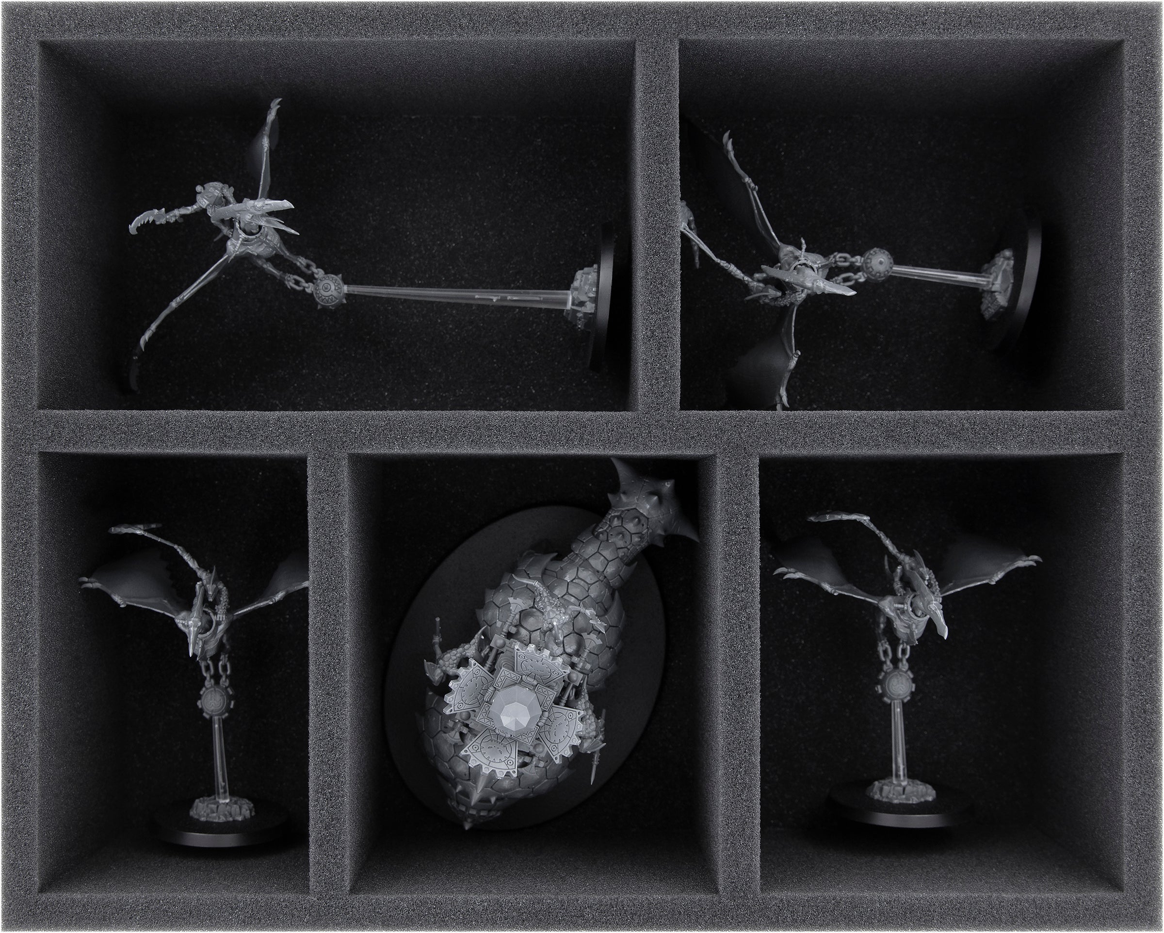 En esta bandeja de espuma Feldherr tienes espacio para hasta 5 miniaturas de tu ejército. El inserto es especialmente adecuado para almacenar los modelos compatibles con y de tamaño similar.