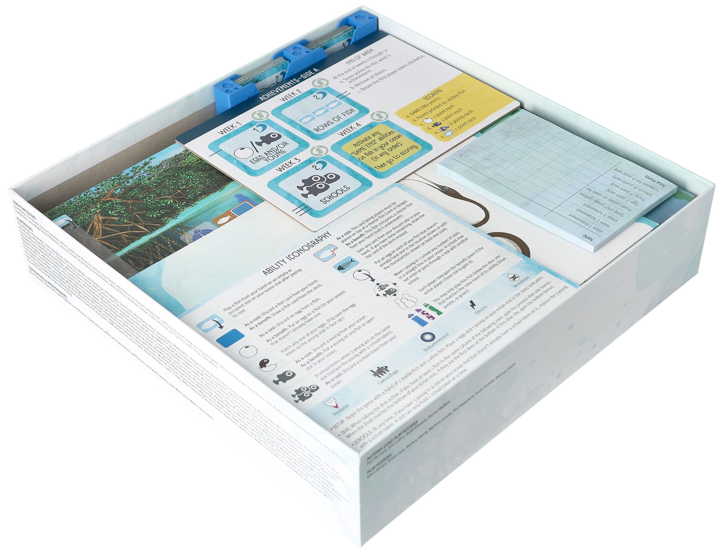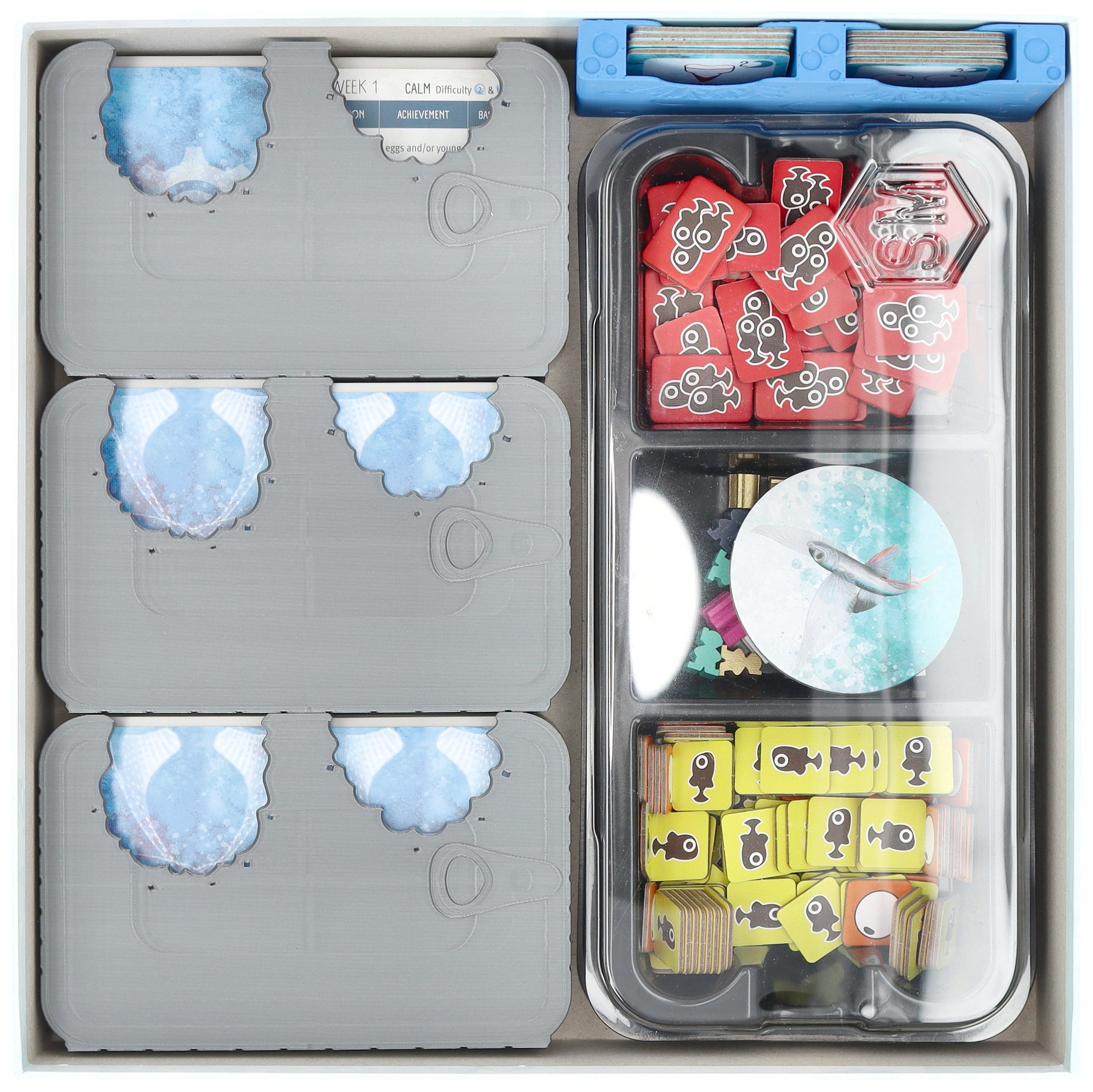 - For optimal storage in the box, the game's original plastic tray is required. It provides a designated place for Divers meeples, First-player Token, Week Tracker Token, Egg and Young Tokens, and School Tokens.