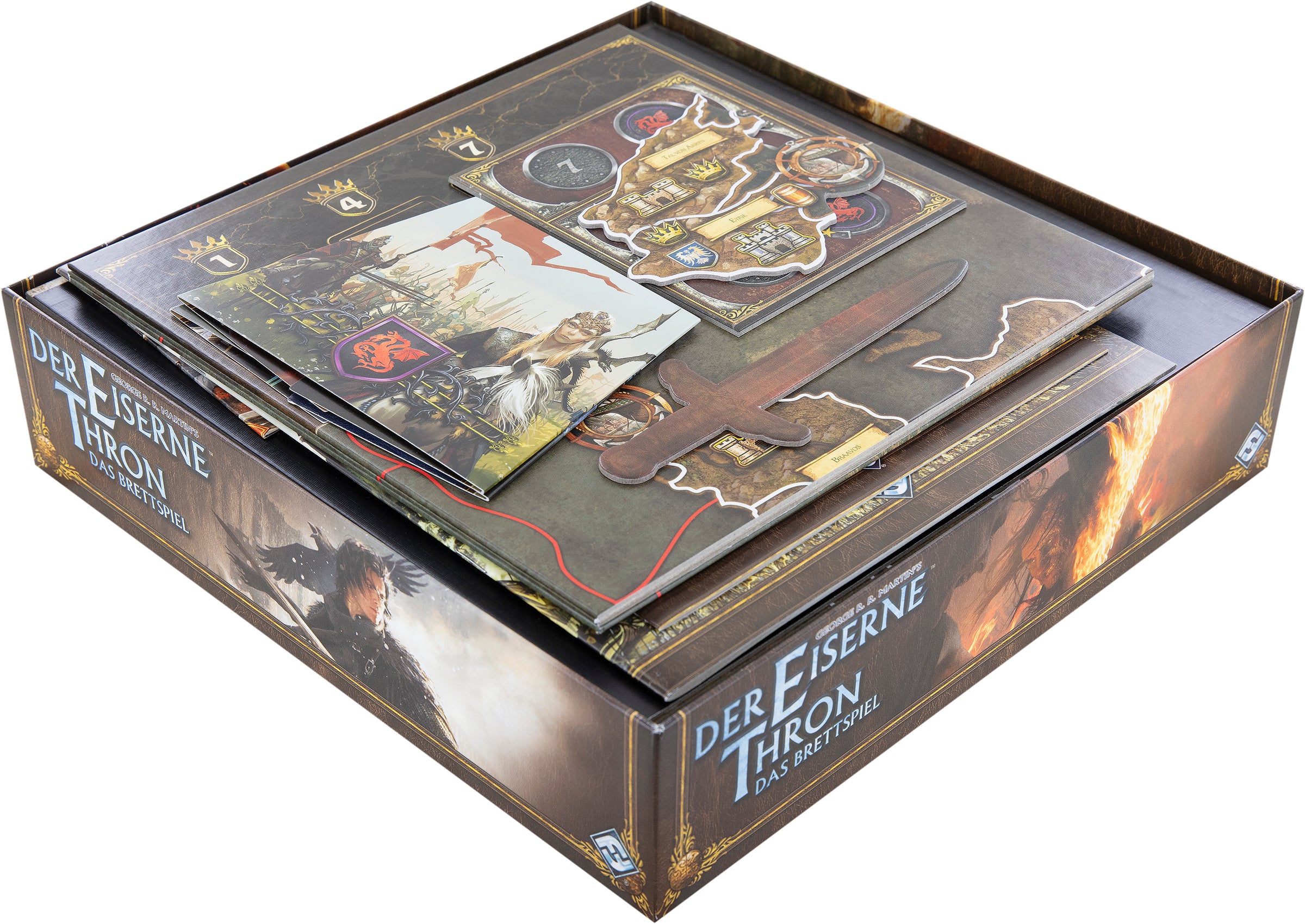 - Place the Rule books, Reference sheets, Player screens, King’s Court Overlay, Influence Track Extension, Eyrie Overlay, Game board, Essos Side board, and the Dominance Token in sword form on the plastic inserts.