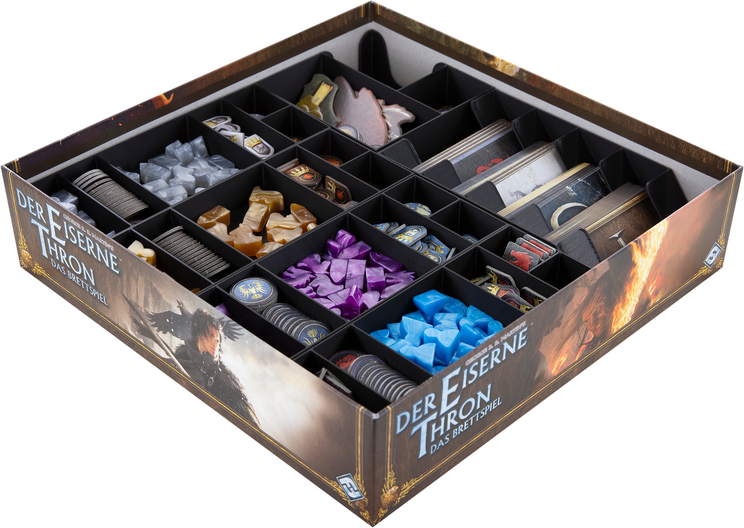 You have to avoid pitfalls, trust nobody, avoid red weddings and control your game material with an iron fist. This Feldherr Organizer will help you stake your claim to the throne. Here you neatly sort your game materials from the “A Game of Thrones: The Board Game Second Edition” core game and dominate your board game box. The Organizer also offers space for the expansion “Mother of Dragons.”