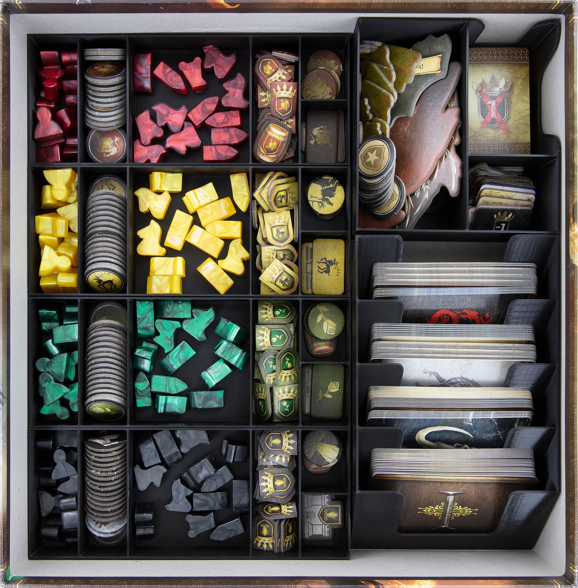 - 8 plastic token holders with 6 compartments for small game components like Plastic Units, Power Tokens, Supply Tokens, Influence Tokens, Order Tokens, Victory Point Tokens, Sea Order Tokens + Dragon Strength Tokens, and Targaryen Loyalty Tokens for House Targaryen.