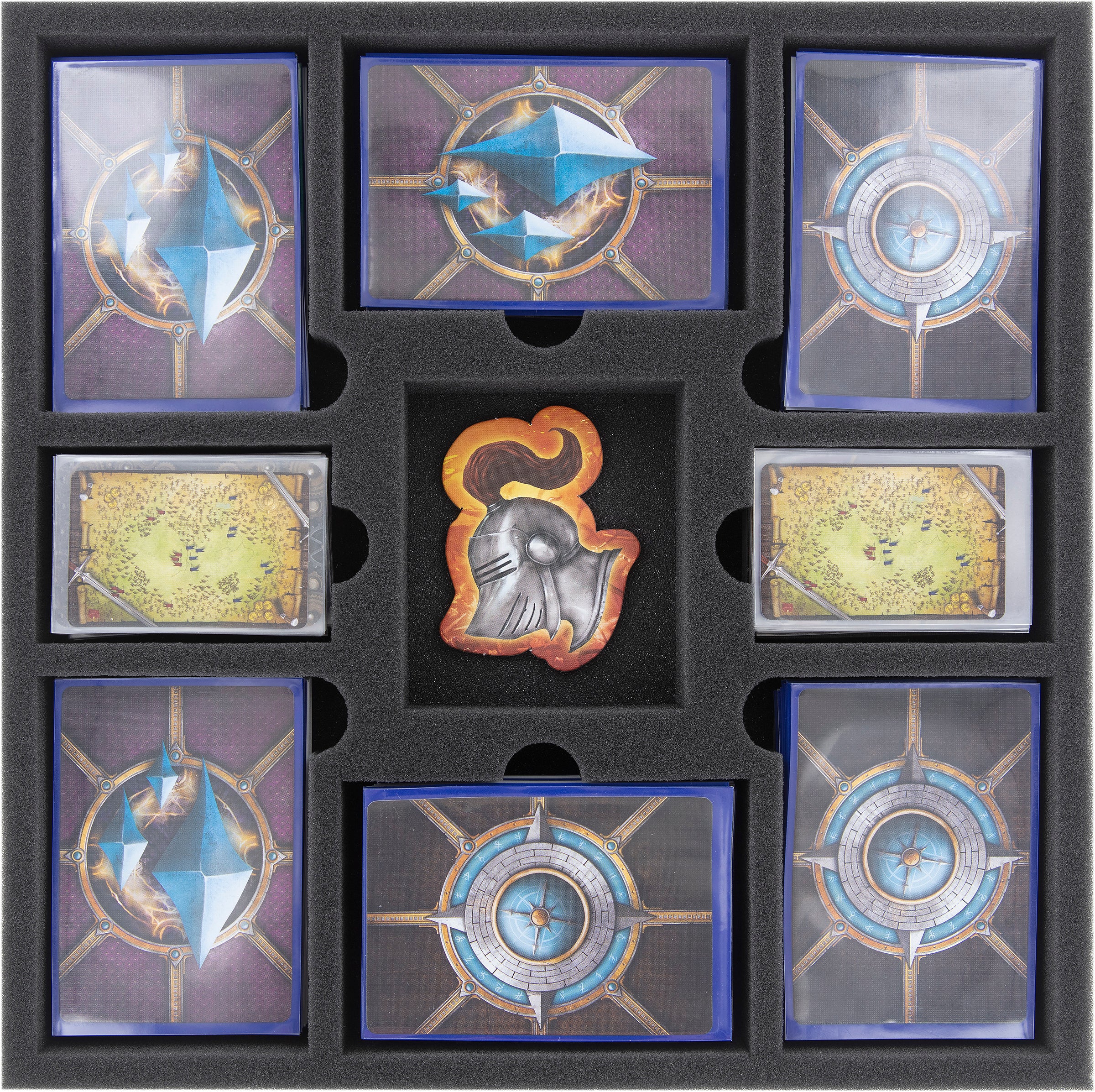 The Feldherr foam tray has 18 compartments which will hold board game accessories, American Mini cards, European Mini cards, American Board Game cards, European Board Game cards and standard cards. Ideal for Star Wars: X-Wing, Star Wars: Armada, Star Wars: Legion or similar games.