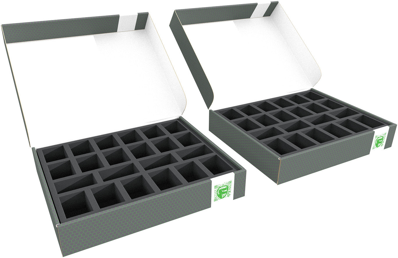 - 2 Full-Size foam trays with 22 compartments each, designed for bulky miniatures on 40 mm bases like Anakin Skywalker, Asajj Ventress, Battle Droids, and models of similar dimensions (FS050A112)