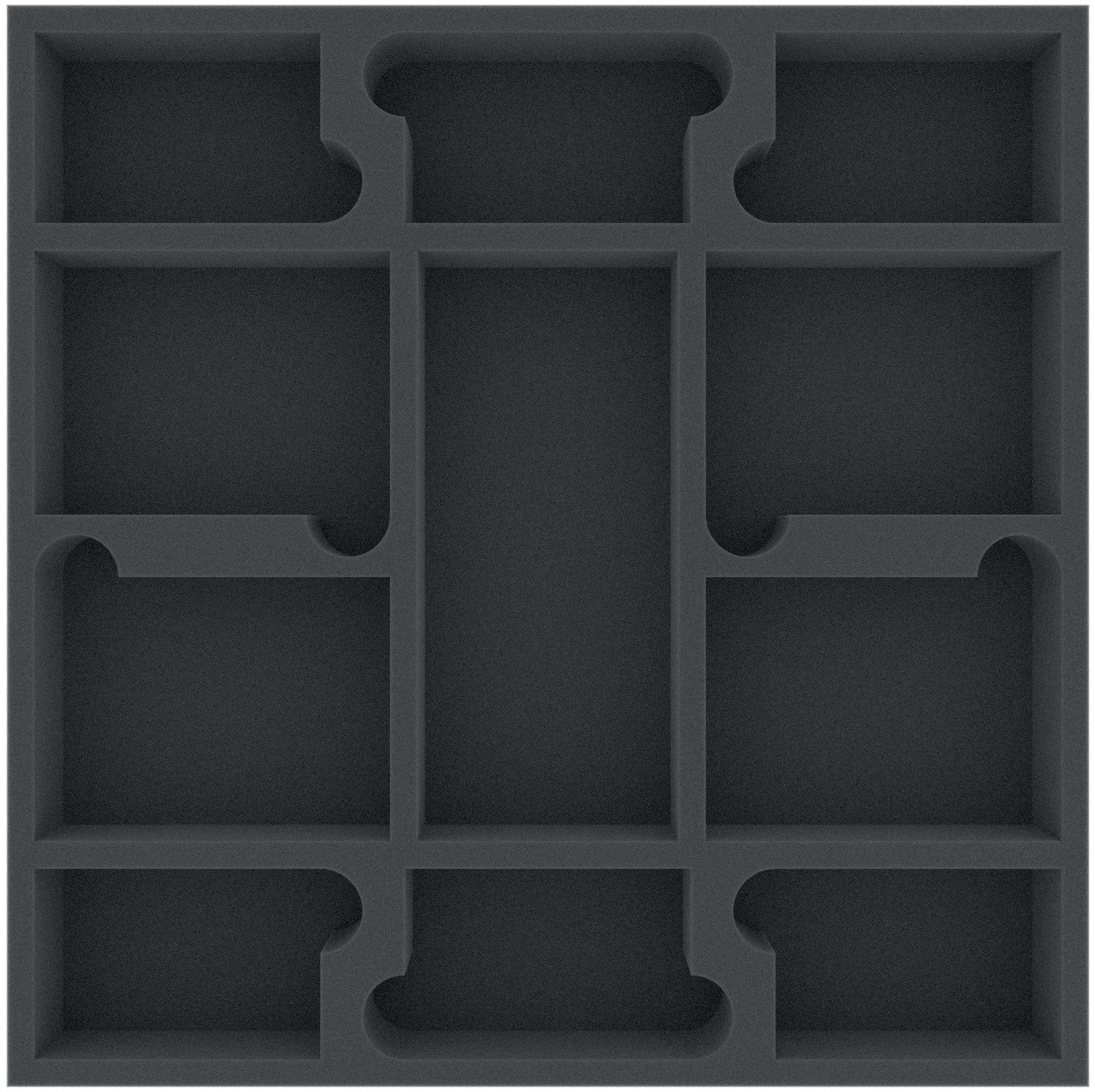 Foam tray especially for Dark Souls board game box. The 11 different sized compartments are suitable for all conceivable game material.