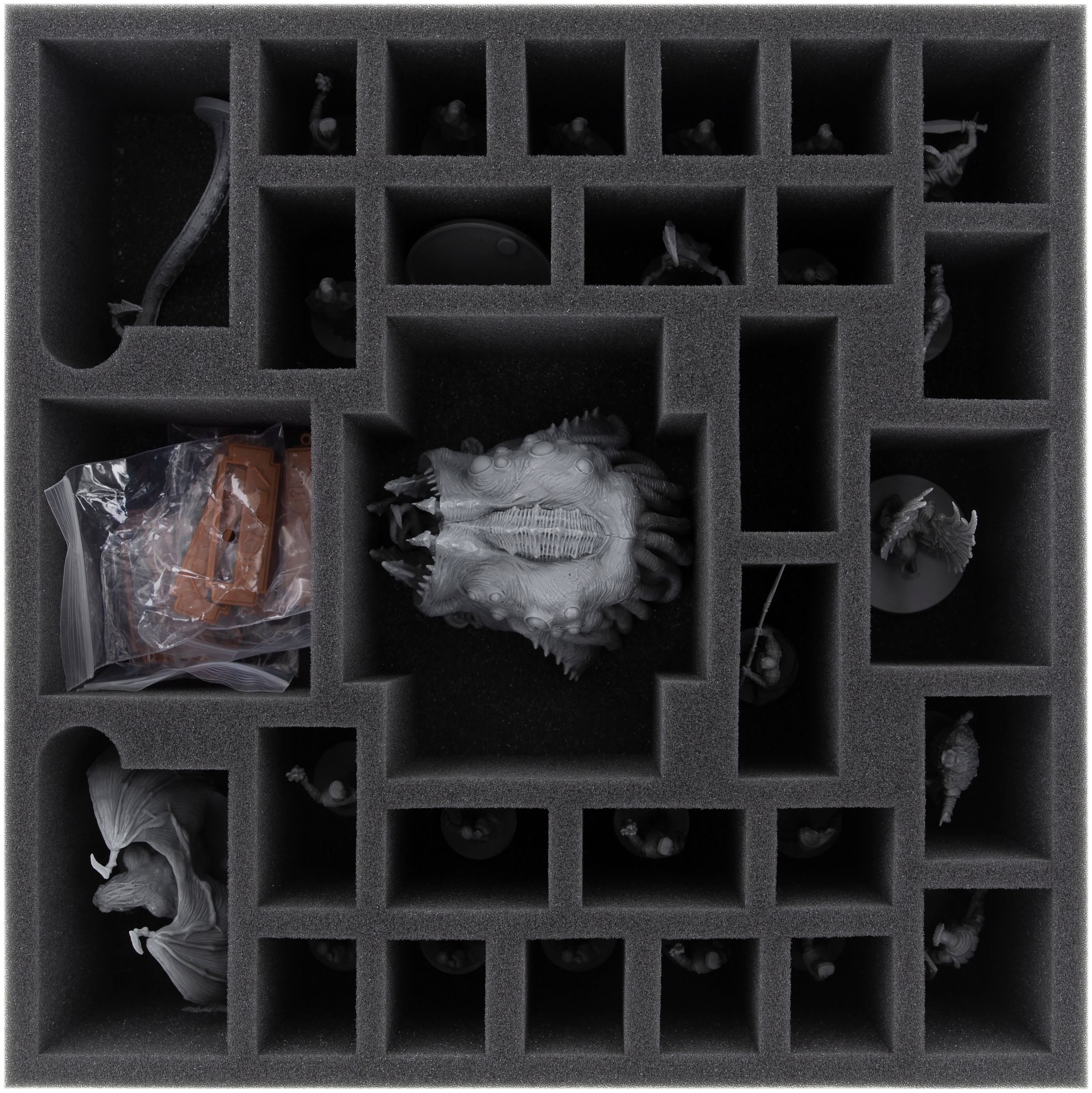 Our foam tray for Mythic Battles: Pantheon allows you to store all miniatures of the Trojan Wars, Keto, Oedipus vs The Sphinx and the Corinthia expansions. The foam tray features 29 custom-cut compartments which safely accommodate the 27 miniatures from the four expansions. In the additional 2 compartments, further game components like Stat Clips can be stored.