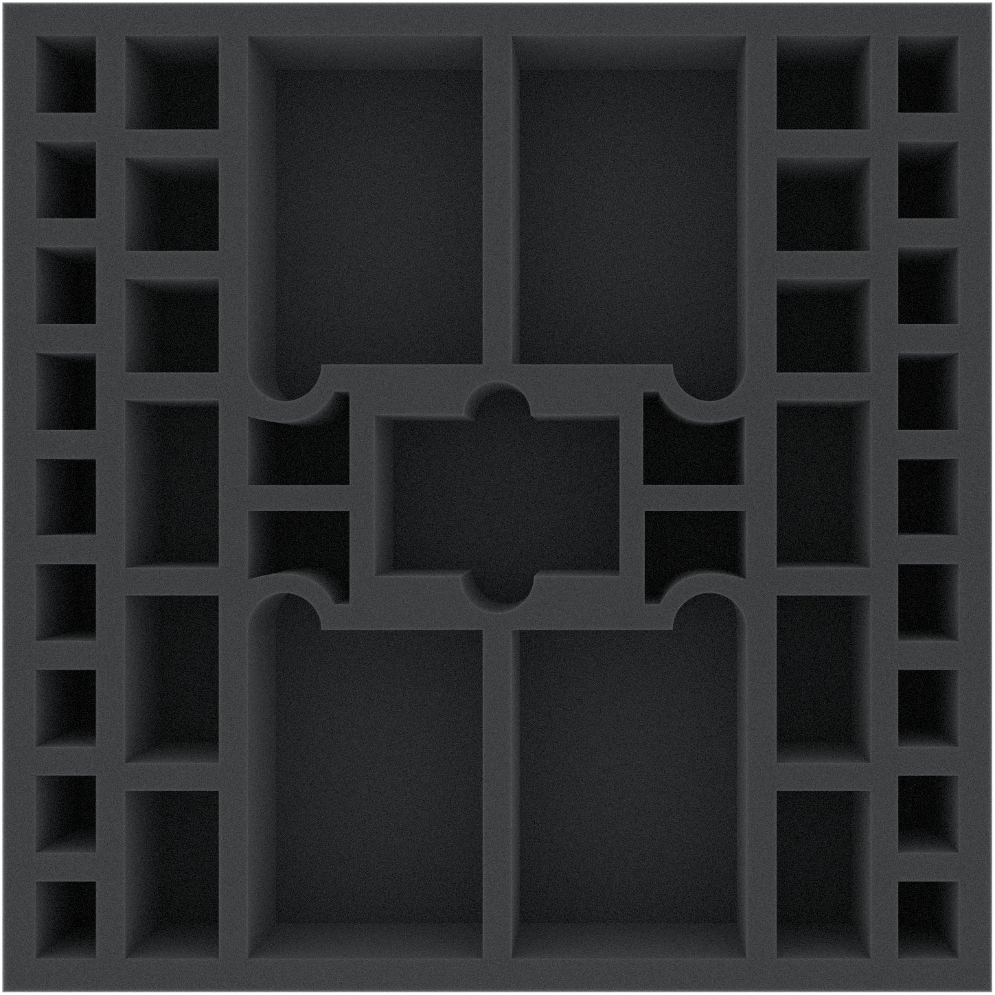 This foam tray is divided into 39 compartments of different sizes. It is particularly suitable as an insert for the safe storage of miniatures and game material in the original board game boxes (e.g. from CMON).