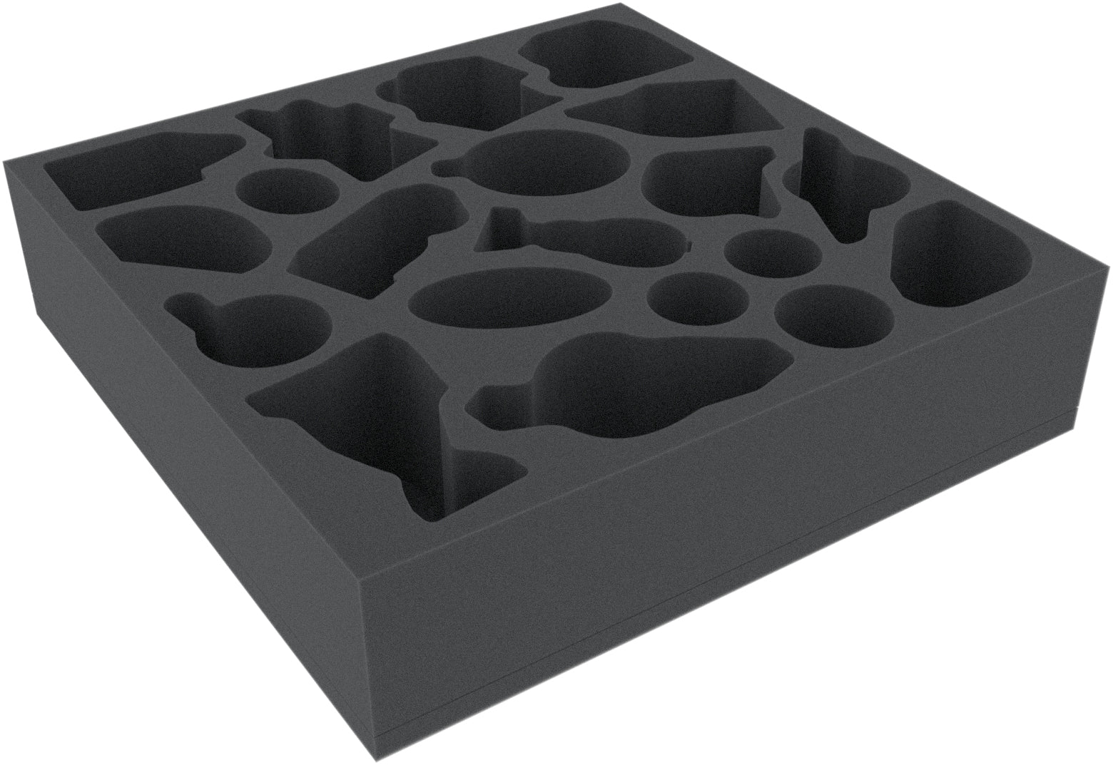 The foam tray has the dimensions: 285 mm x 285 mm x 70 mm total height (60 mm usable height + 10 mm foam base).