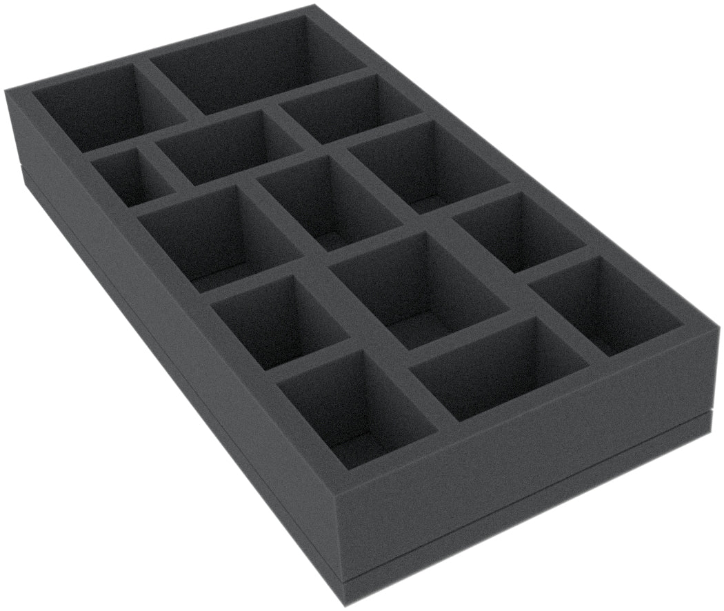 This 45 mm high foam tray is divided into 14 compartments. It is particularly suitable for the safe storage of tabletop and board game miniatures, as well as other fragile models and small parts.