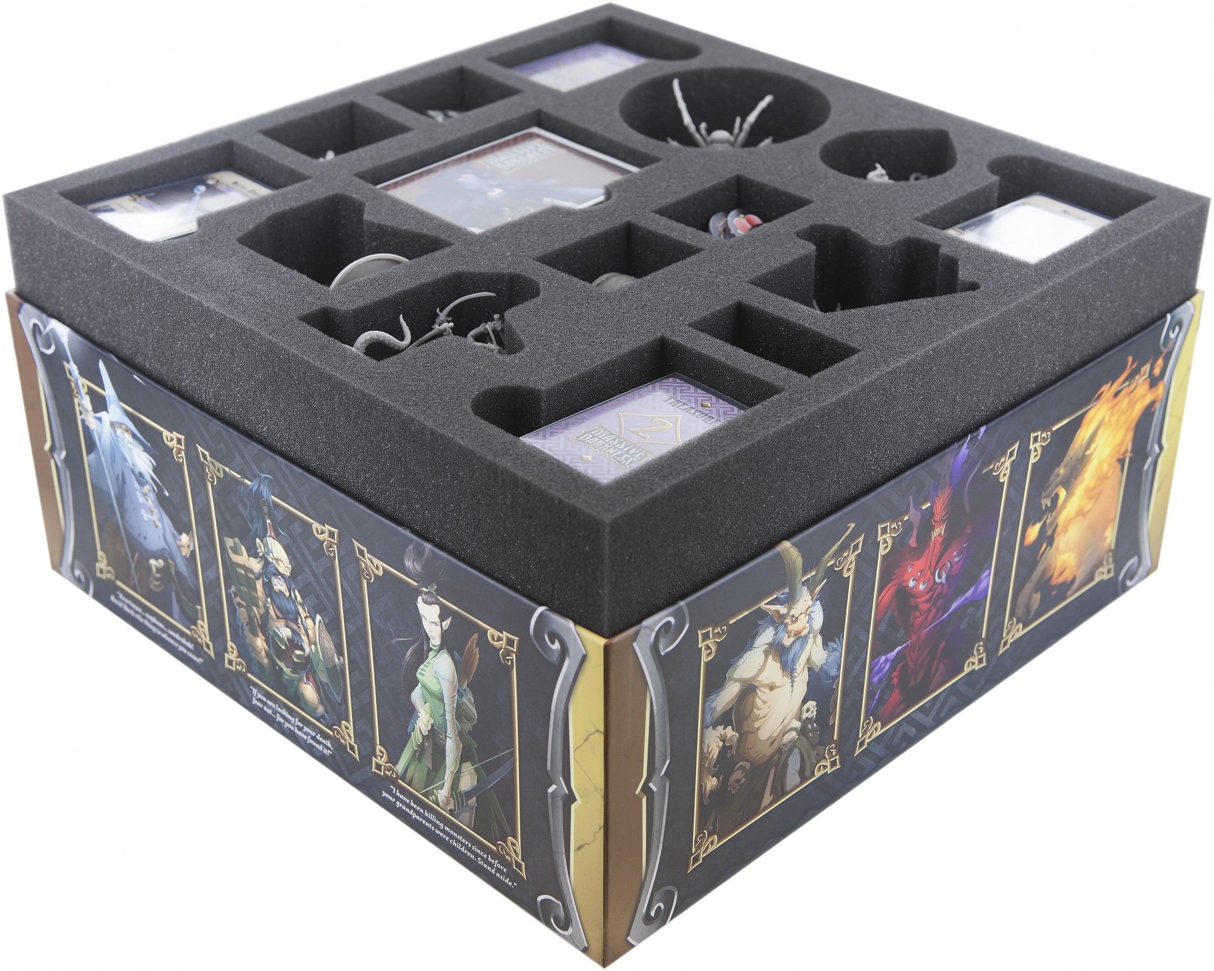 The foam tray is especially produced for the monsters and game equipment of the Massive Darkness boardgame. In five individually monster-shape produced compartments it's place for the Giant Spider, Abyssal Demon, Liliarch, High Troll and the Hellhound. The mat offers you ten further cut-outs for the Hero Color Bases, Color Pegs, Combat Dices, Wound Tokens, Door Tokens, Pillar Tokens, Level Tokens, Starting Zone Token, Treasure Tokens and all cards in sleeves.