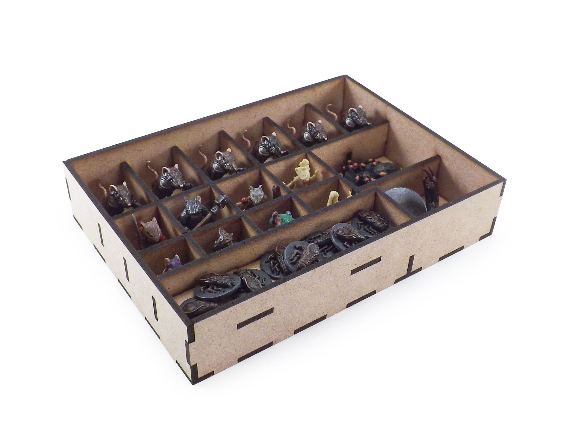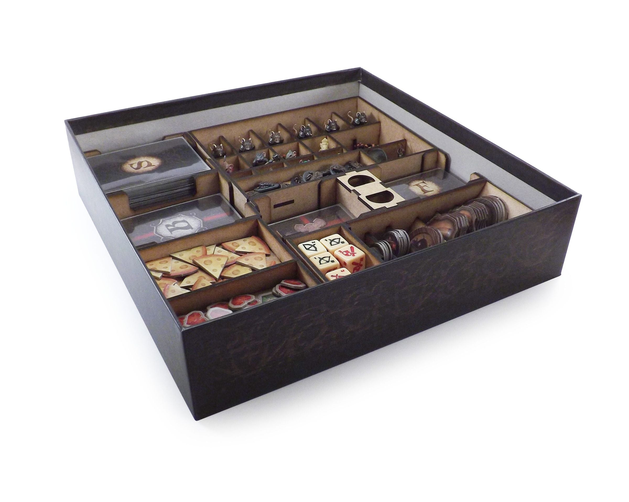 When mice are the heroes, you'll see your adventures from a whole new perspective. Cheese, mouse traps, effect markers, action dice, lots of cards and figures of hostile vermin quickly crowd your table. Our insert groups and sorts all these components and creates order in the mouse hole.
