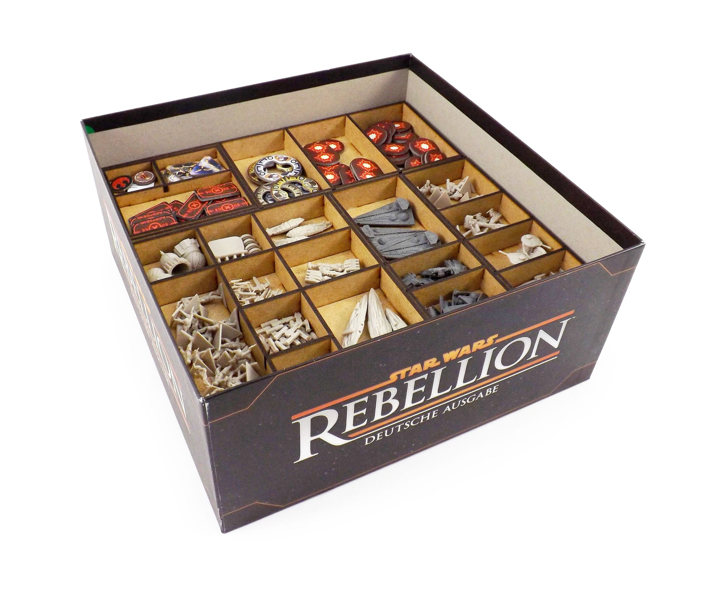 A small group of rebels challenges the military might of the Galactic Empire. The future of the galaxy is at stake! This epic conflict brings literally hundreds of spacecraft miniatures as well as several stacks of cards, leaders, markers and dice onto the table. Our insert offers custom storage for all components of base game and expansion, giving the factions full control over their assets.