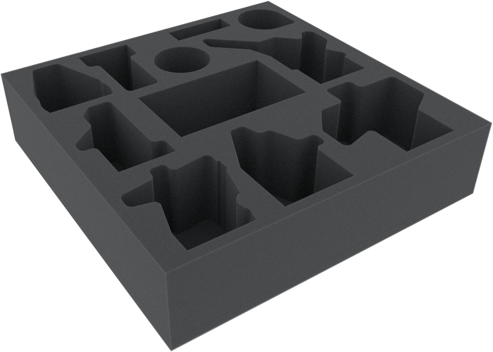 The foam tray is perfectly adjusted for the big miniatures of the Rinsing Sun Core Game. Thanks to compartments you have a perfect place for your miniatures.
