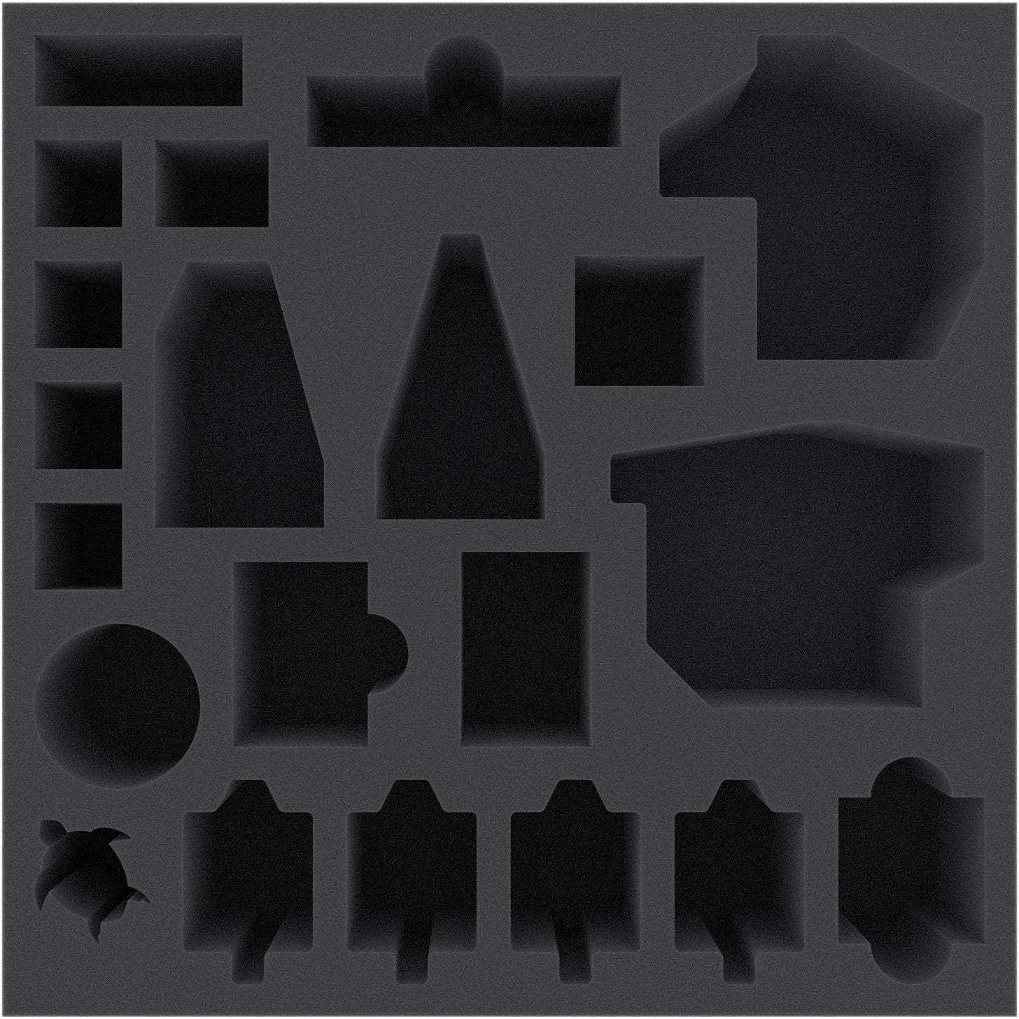 Each monster has an own individual shape in the foam. The compartments for the Turtle Strongholds are specially designed for the miniatures.