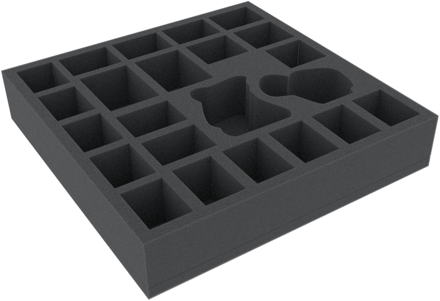 This foam tray has 23 compartments for the 23 miniatures of the "Darkness Falls" expansion of the board game "Sword and Sorcery". The foam tray fits exactly into the original board game box.