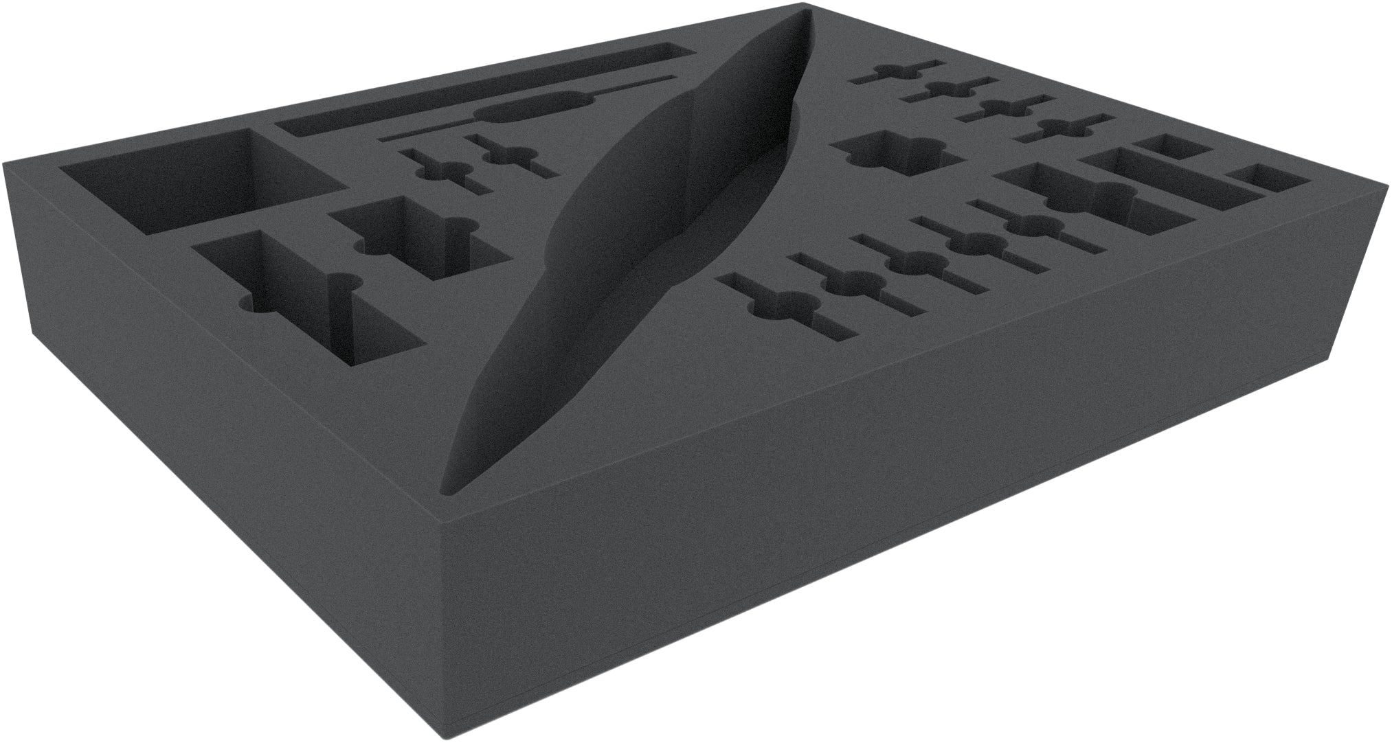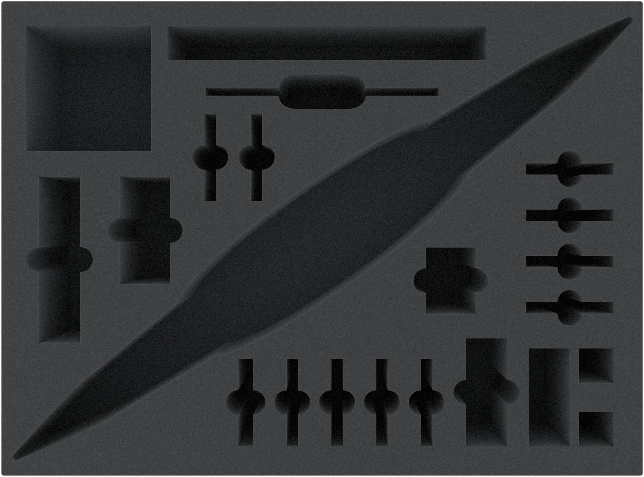 - The foam tray has the following dimensions: 770 mm x 570 mm x 130 mm total height (120 mm usable height + 10 mm foam base)