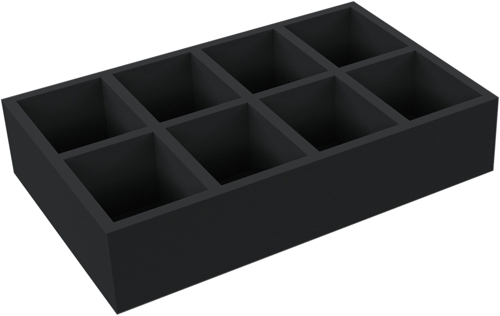 FELDHERR foams in AN format 550 x 350 mm fit in double-size storage boxes, in 64 / xx euro containers from Auer and in euro boxes / stacking containers from SSI Schäfer in EF 6140 format.The foam insert has the dimensions: 550 mm long x 350 mm wide x 110 mm total height. The usable height inside is 100 mm. The already glued floor is 10 mm high.