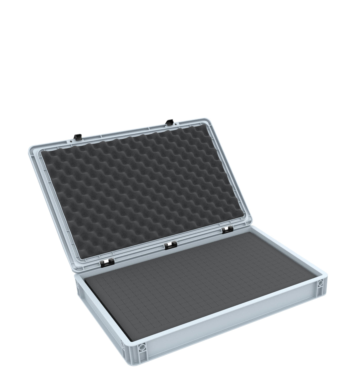 Set of Eurobox 600 mm x 400 mm x 40 mm filled with 1 Pick and Pluck foam insert. The grid of the foam allows an individual adaptation of the foam inserts to all shapes. It is ideally suited as protection for the transport of various industrial products such as medical equipment, tool components or technical equipment. The pick and pluck foam is perforated with a grid of 20 mm x 20 mm x height of the insert (40 mm) and a circumferential edge of 25 mm. As a bottom we use a 10 mm thick base (DS010B), which makes it possible to transport even heavy products. The nap foam serves as top cover and is cut exactly to fit the lid of Auer's Eurobox. Since it is equipped with a self-adhesive foil, you do not need any further tools. All you have to do is remove the adhesive foil from the foam insert and glue the self-adhesive side into the hinged top of the Eurobox. The entire set can therefore be designed, adapted and used according to your personal needs without special tools.