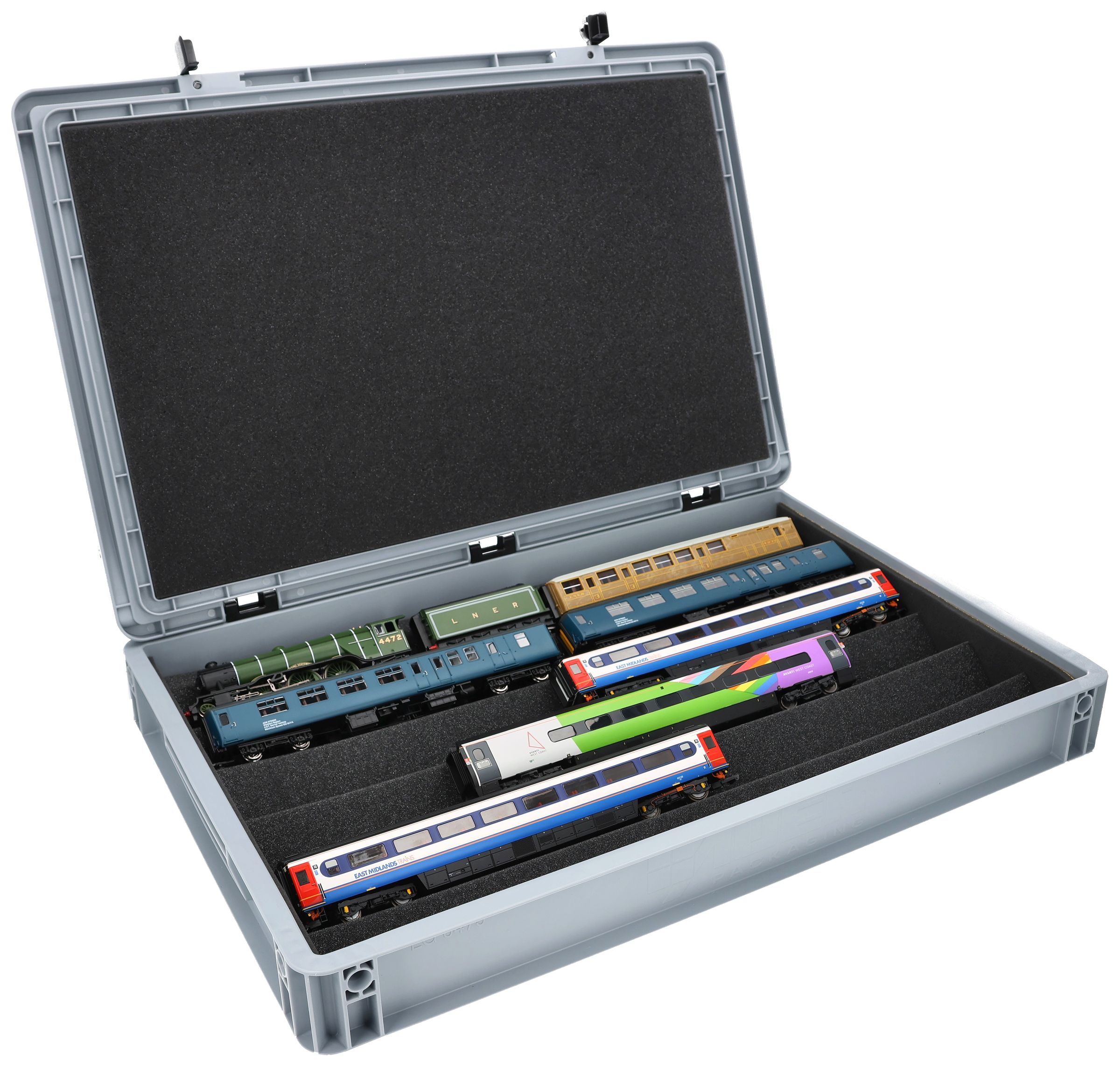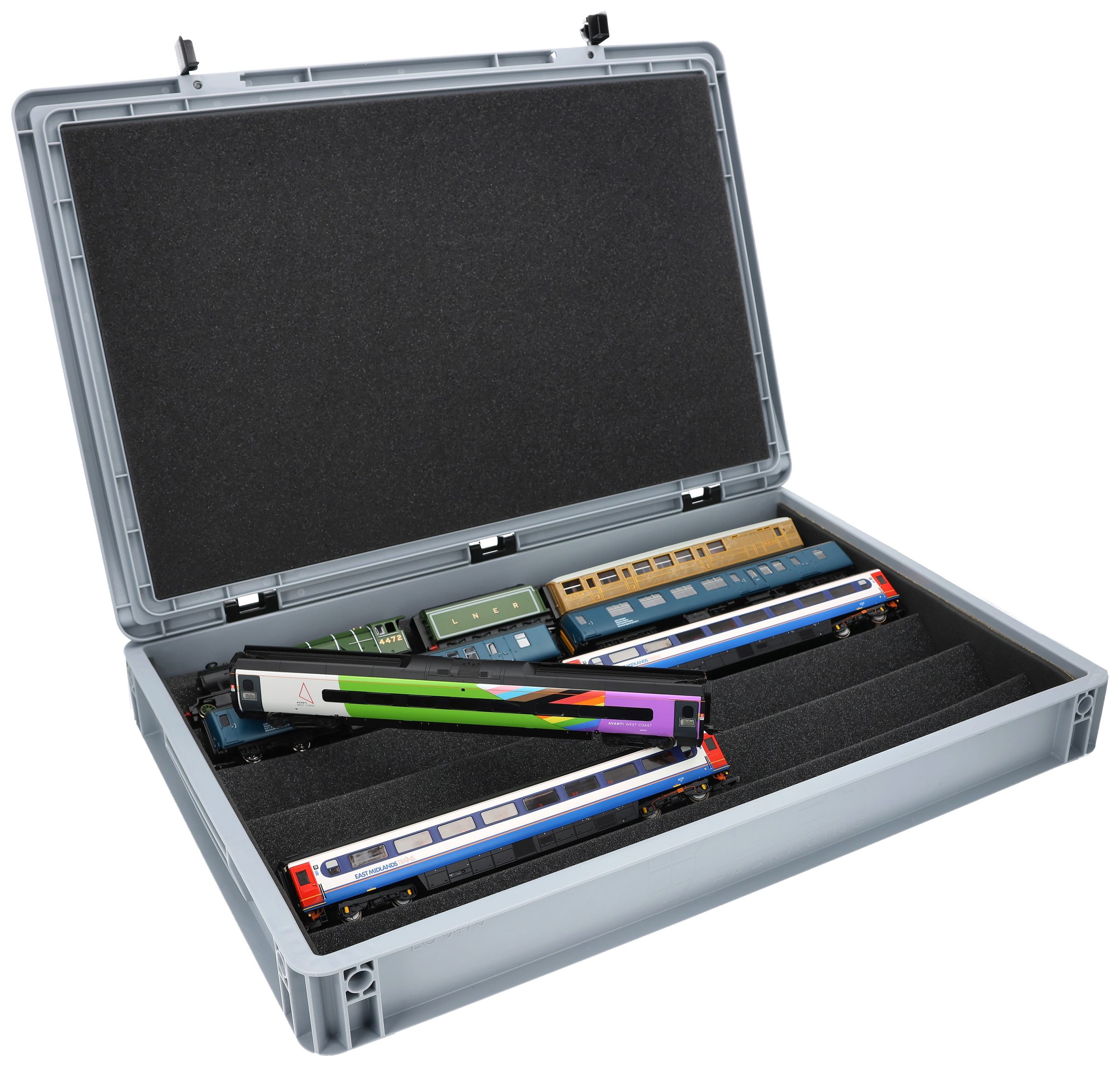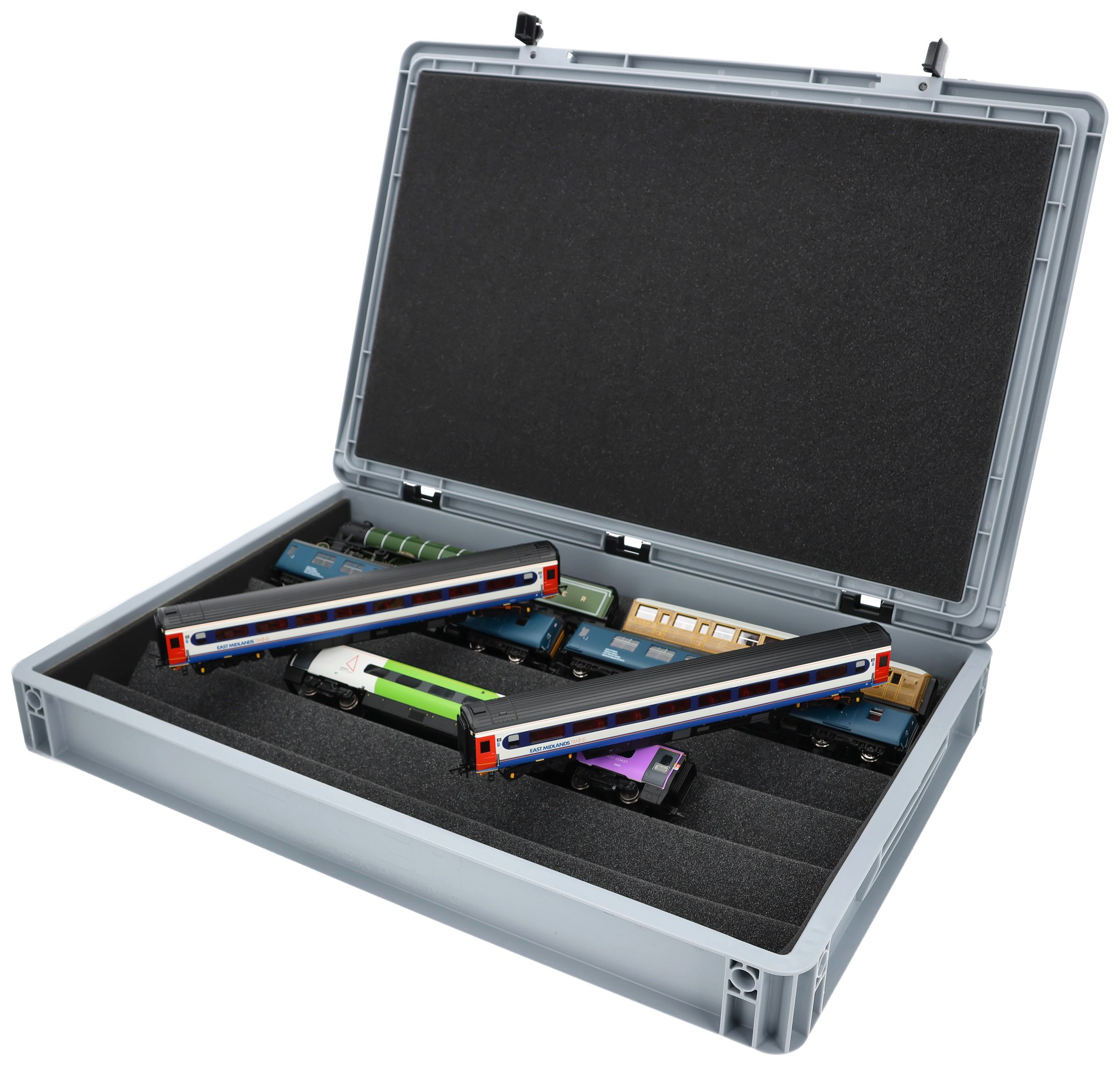 The ultimate solution for serious OO gauge railway modellers - expertly stored, elegantly displayed, and securely transported. This premium flexible foam insert system for OO scale model railways comes complete with a robust Euro container for the discerning British railway enthusiast.