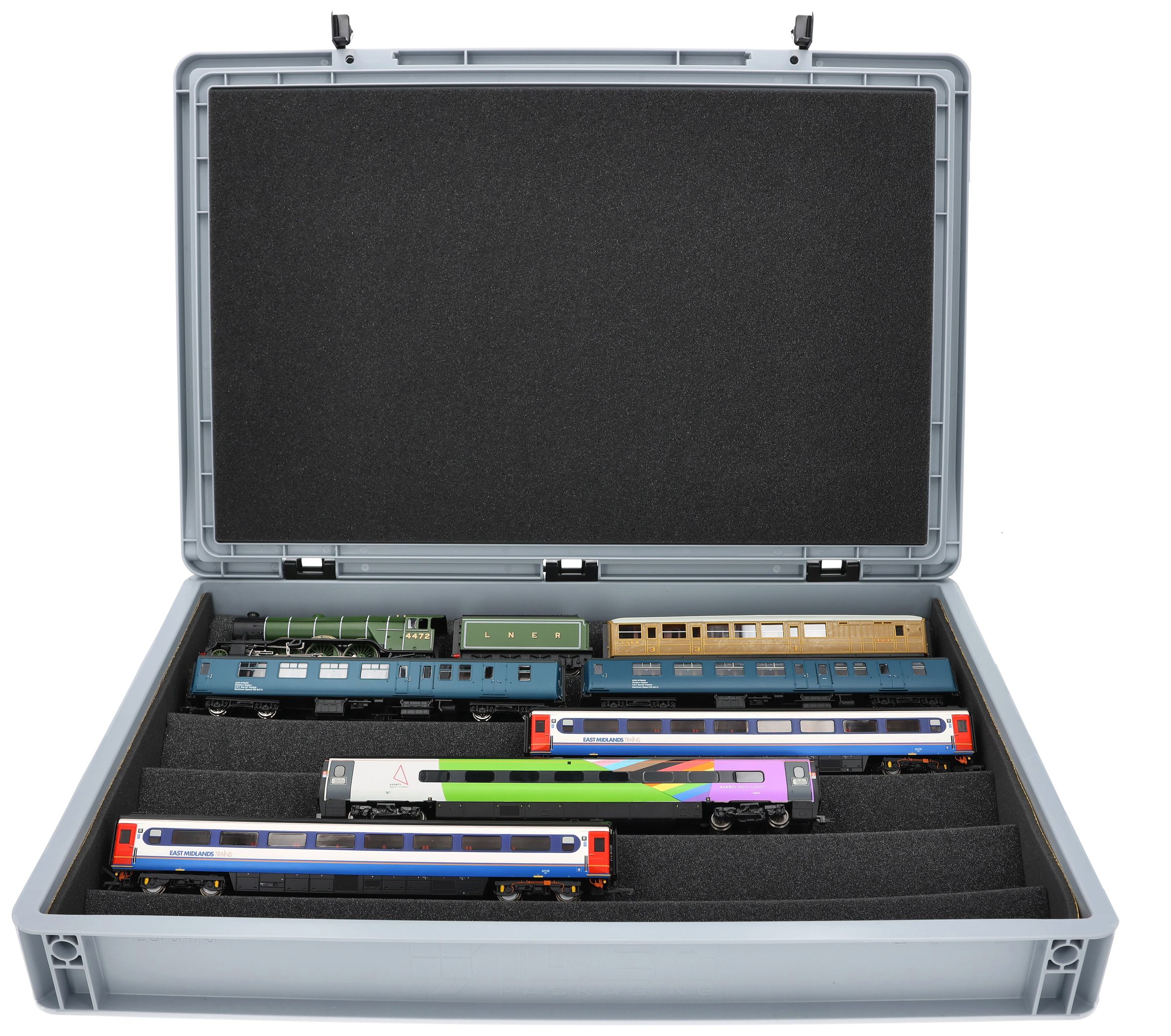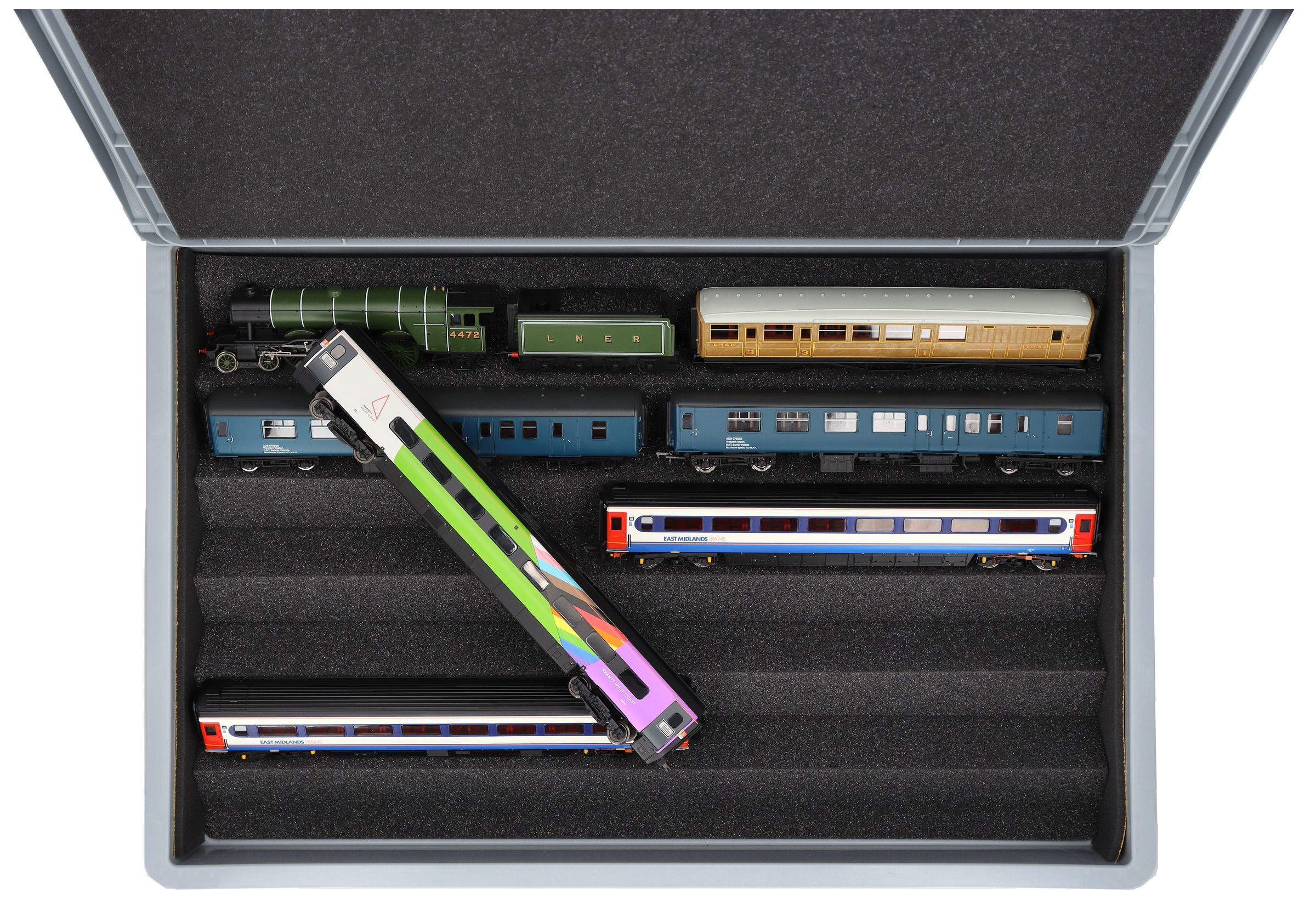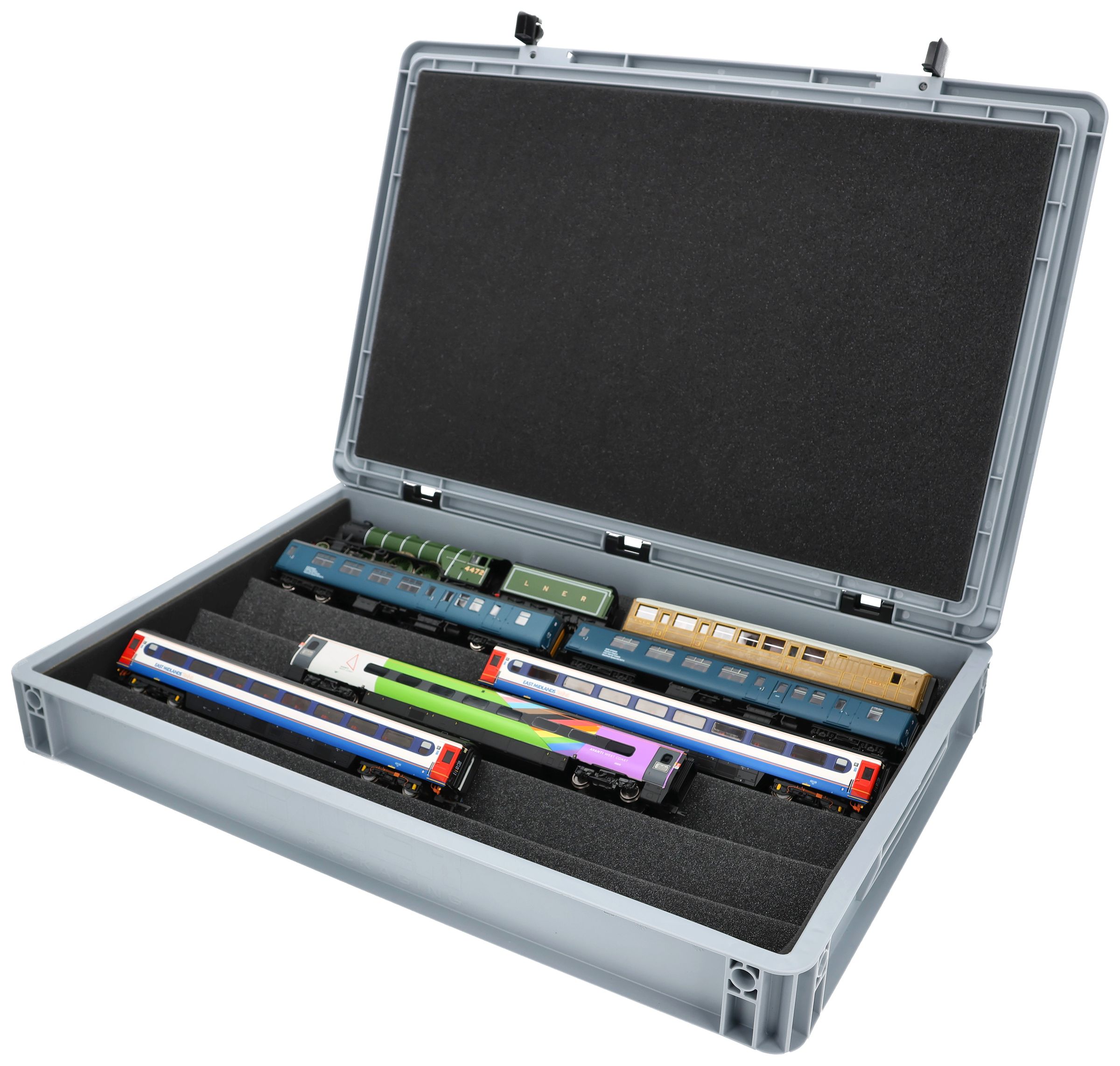 The ultimate solution for serious OO gauge railway modellers - expertly stored, elegantly displayed, and securely transported. This premium flexible foam insert system for OO scale model railways comes complete with a robust Euro container for the discerning British railway enthusiast.