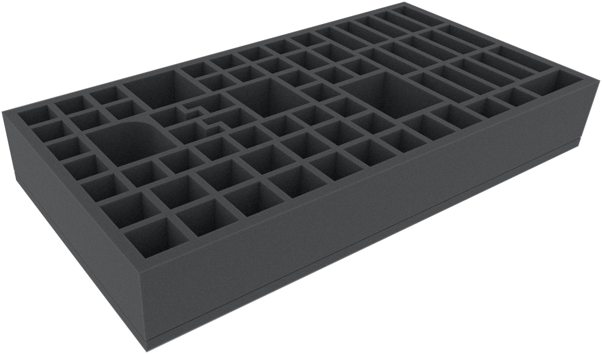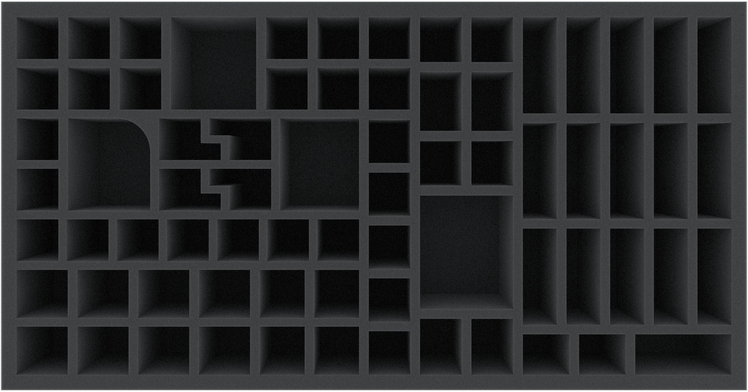 This 70 mm high foam tray is divided into 68 compartments. It is particularly suitable for the safe storage of tabletop and board game miniatures, as well as other fragile models and small parts.