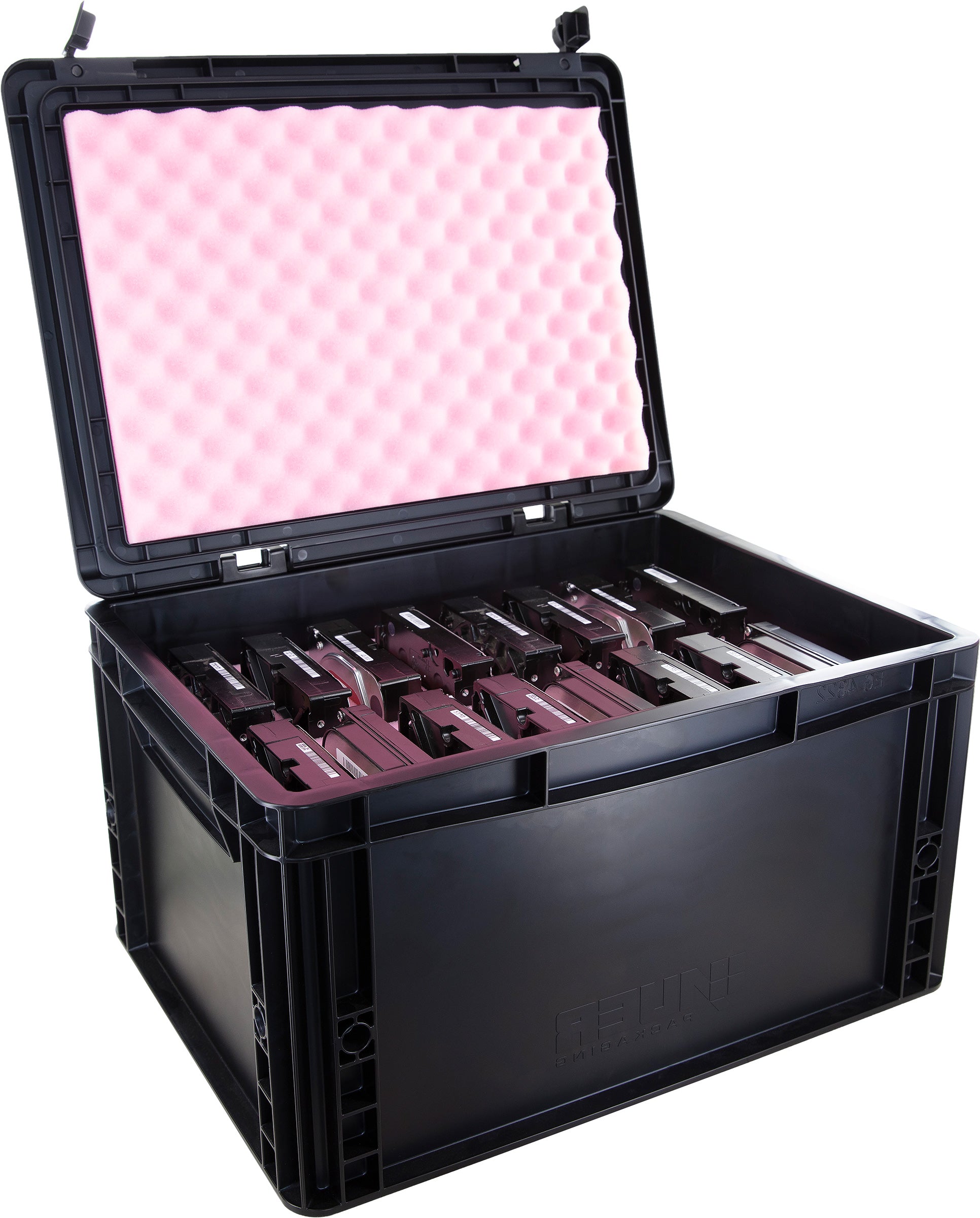 The vertical arrangement of all 16 hard drives enables direct access to all connectors without removal from the foam. Labels remain visible through targeted overhang - for professional data management and quick identification even with large quantities.