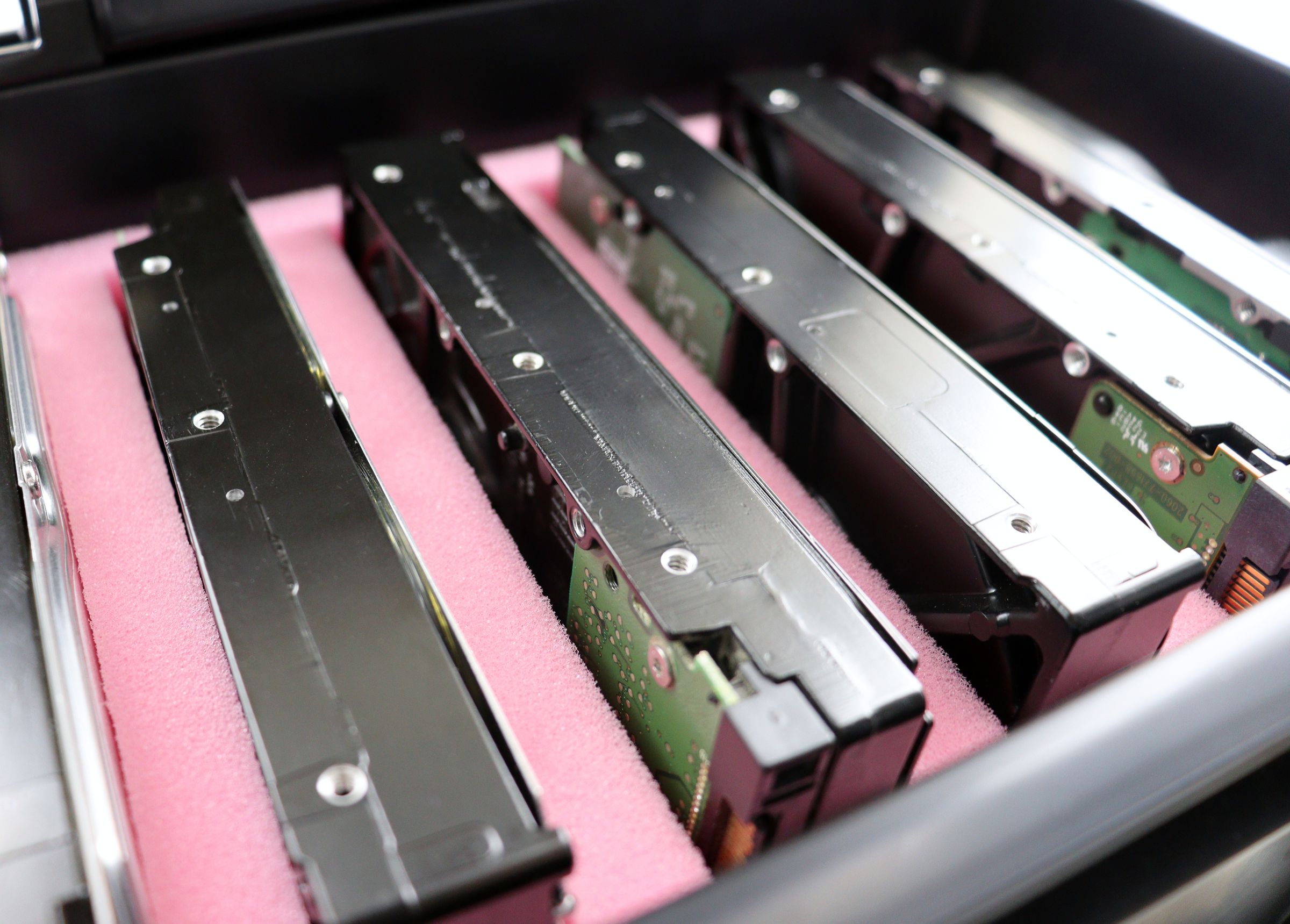 The vertical arrangement enables direct access to all hard drive connectors without removal from the foam. Labels remain visible through targeted overhang - for professional data management and quick identification in daily operations.