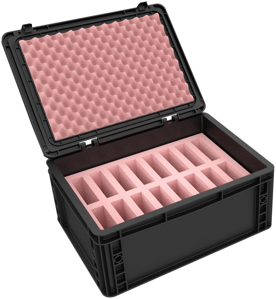 All-around protection concept: ESD foam insert with 16 precision cutouts rests on a 10mm leveling base, while 20mm convoluted foam provides top fixation. The self-adhesive convoluted foam fits exactly into the lid groove and can be permanently fixed - for consistently professional protection.