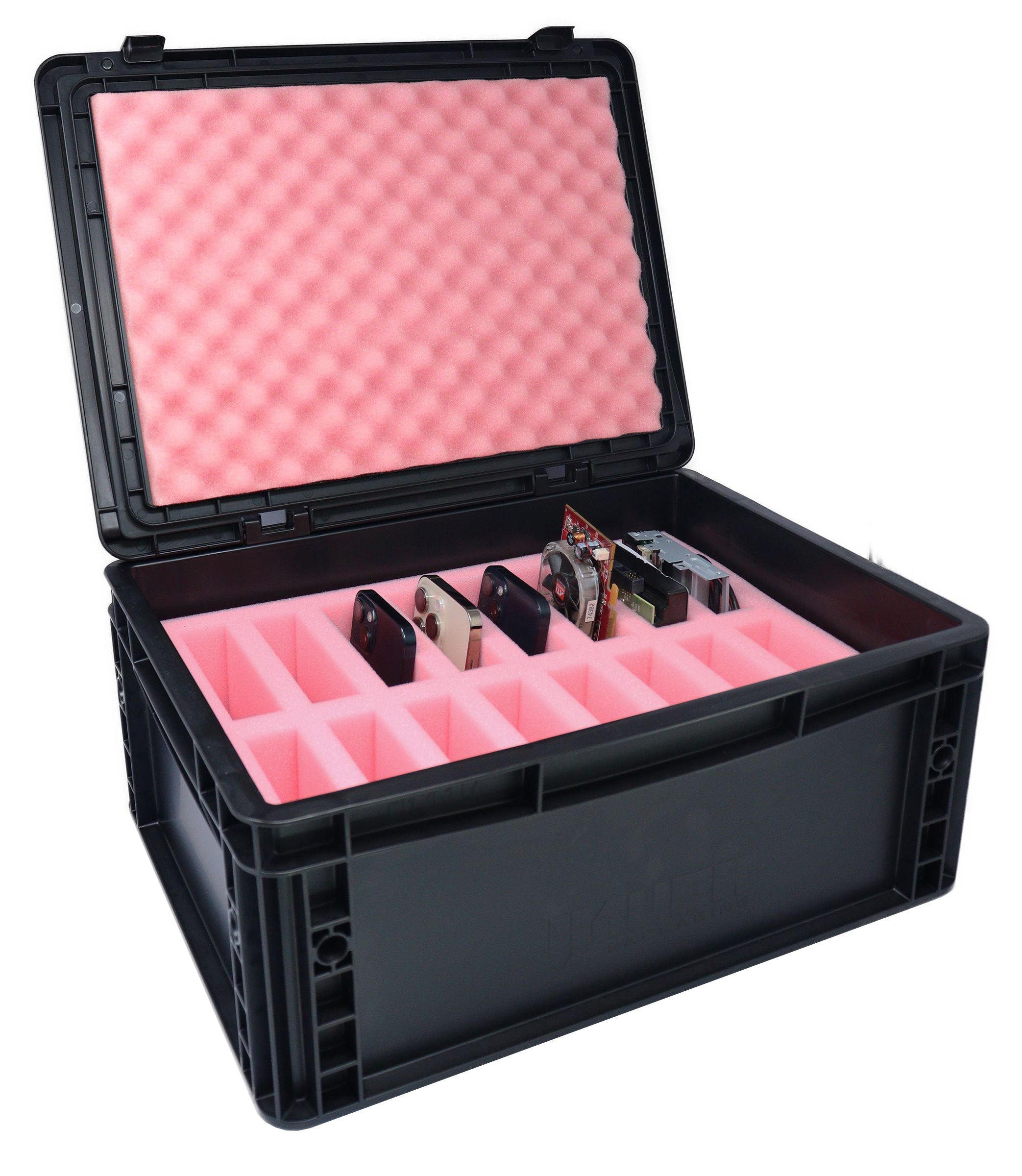 The 16 cutouts (103x27x120mm) are ideal for ESD-sensitive components, tools and work/auxiliary equipment up to 137mm height. Maximum flexibility for diverse transport requirements in industry, electronics manufacturing and precision technology.